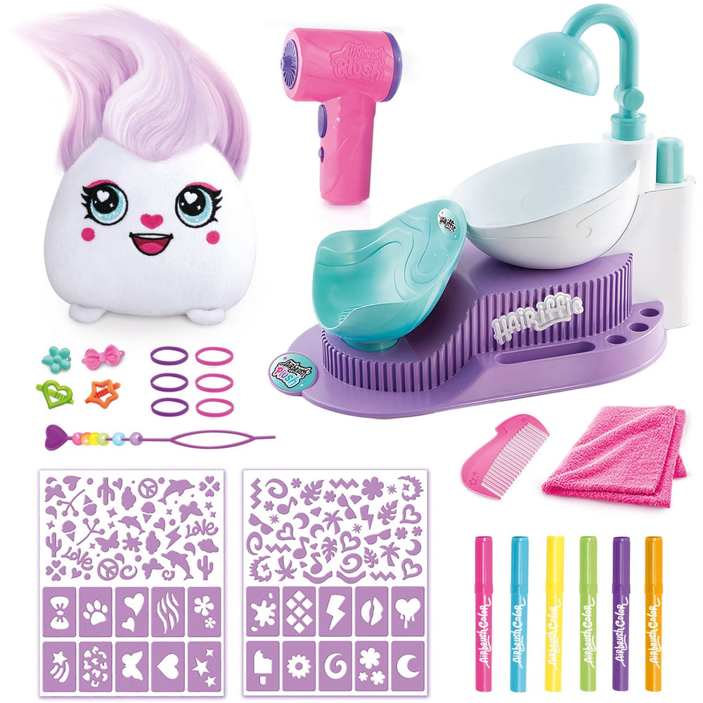 Upptäck glädjen och kreativiteten med Airbrush Plush Hair-Iffic Hair Style Salon, den perfekta leksaken för ditt barn som älskar att utforska och skapa. Denna unika produkt låter barnen färga och styla en plyschfigur på ett säkert och underhållande sätt, användandes en airbrush, färgglada markörer och lekfulla schabloner.
