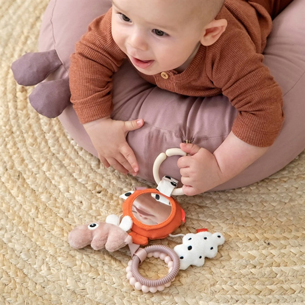 Den innovativa designen inkluderar en mjuk och färgglad spegel som uppmuntrar till självupptäckt och visuell spårning, en viktig del för barnets utveckling. Speglens material och konstruktion är noggrant utvalda för att garantera säkerhet, undvika skarpa kanter och är lätta att rengöra. Dessutom är produkten lätt och kompakt vilket gör den enkel att ta med sig på resor och lika enkel att förvara när lekstunden är över.