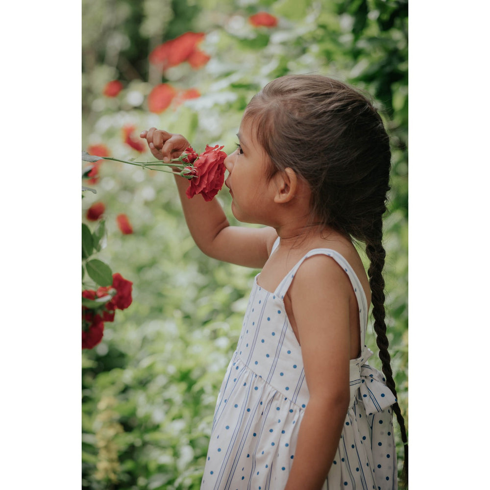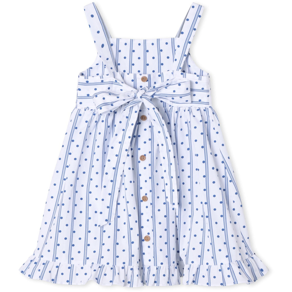 Vi presenterar "Fliink Cloud Dancer Dot Aop Polka Dress" - en drömmande dans av prickar och delikata tryck! Den här vävda sommarklänningen är tillverkad av 100 % bomull och har ett lekfullt ok på bröstet och en charmig volangfåll som gör varje snurr härlig. Breda remmar garanterar komfort hela dagen, medan de dubbla knapparna i ryggen och knytskärpet ger både funktionalitet och en söt rosettdetalj. Perfekt för soliga dagar eller festliga sammankomster, det gör att ditt barn ser bedårande ut och känner sig luftigt. Tvätta och använd enkelt med våra skonsamma skötselråd!