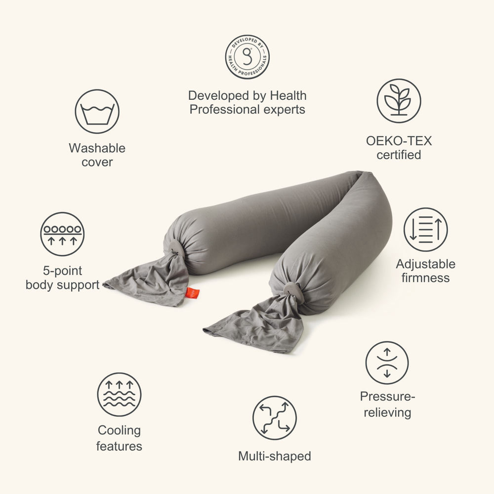 Denna mångsidiga graviditetskudde är inte bara anpassningsbar i form och fasthet utan även tyst tack vare dess fyllning av mikropärlor som effektivt lindrar tryck och smärta. Med sin extra långa design erbjuder kudden stöd för hela kroppen, optimalt för olika sovställningar.