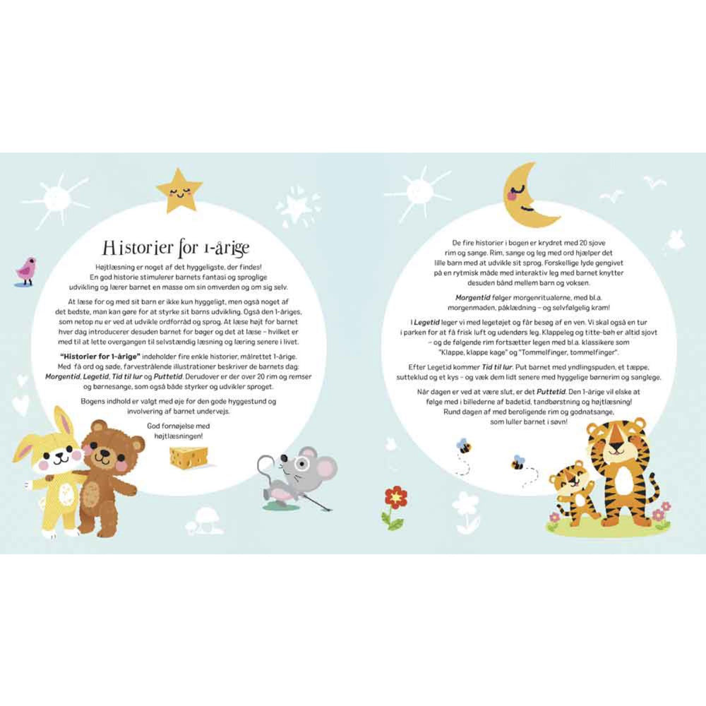 **Sagor för 1-åringar** består av fyra lättsamma och färgglada berättelser som följer barnets dagliga rutiner, från morgon till läggdags. Varje sida i boken är rikt illustrerad och användningen av enkla ord gör boken lättillgänglig även för de yngsta barnen. Boken är också fylld med över 20 roliga ramsor, barnvisor och sånglekar som inte bara är underhållande utan också pedagogiska, och bidrar till att stärka barnets språkförståelse och ordförråd.