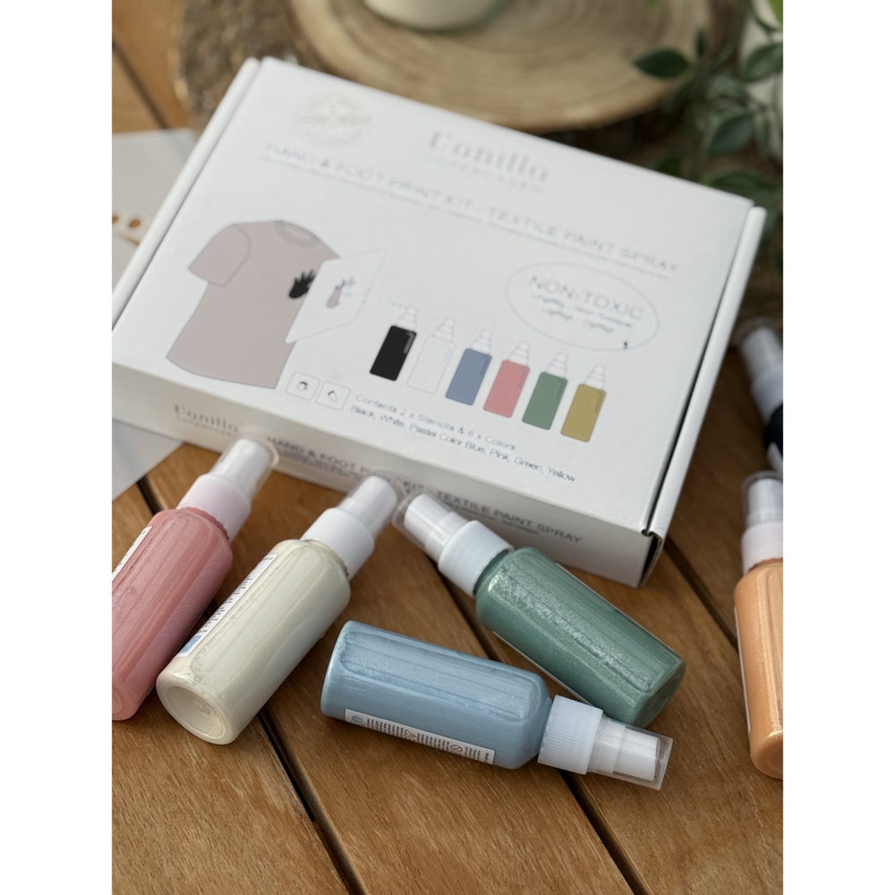 Ge dina barn chansen att sätta sin personliga prägel på kläder och tyger med Vanilla Copenhagen Multi Tyg Paint Spray Hand & Foot Print Kit. Detta roliga och kreativa kit låter dig föreviga barnens hand- eller fotavtryck på ett säkert och enkelt sätt, vilket skapar minnen för livet.