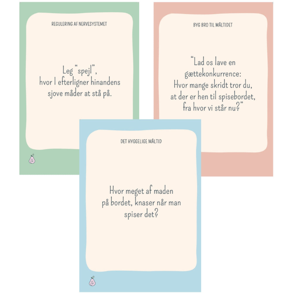 Med kort som föreslår kroppsliga övningar för att reglera barnets energi före måltid, spel som lockar de små till matbordet och fantasieggande konversationskort som håller uppmärksamheten vid liv under måltiden, är detta kortset en mångsidig hjälpreda. Idelämpligt för barn mellan 2 och 10 år, anpassat efter deras utvecklingsnivå för att säkerställa både säkerhet och lärande.
