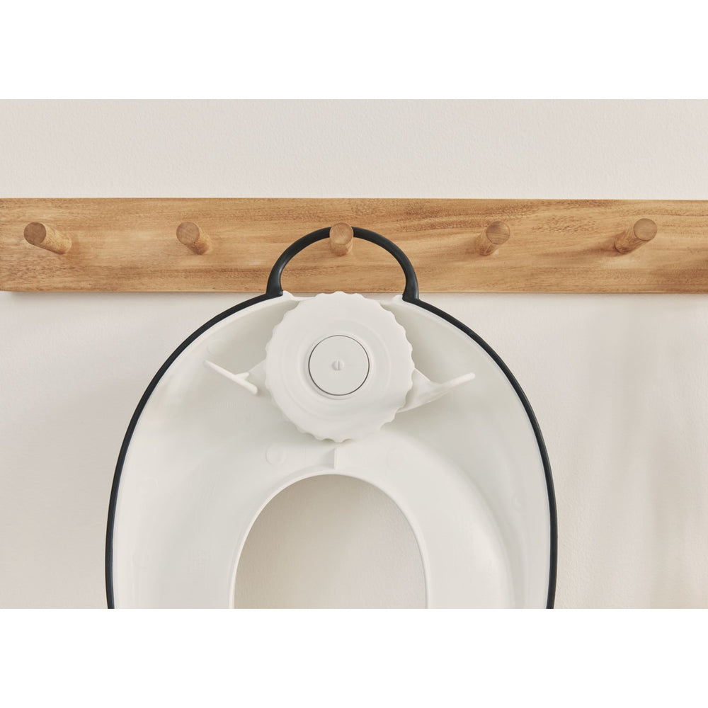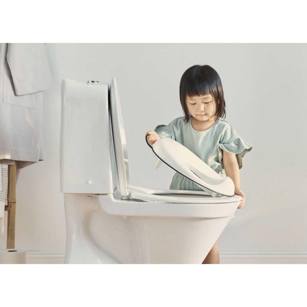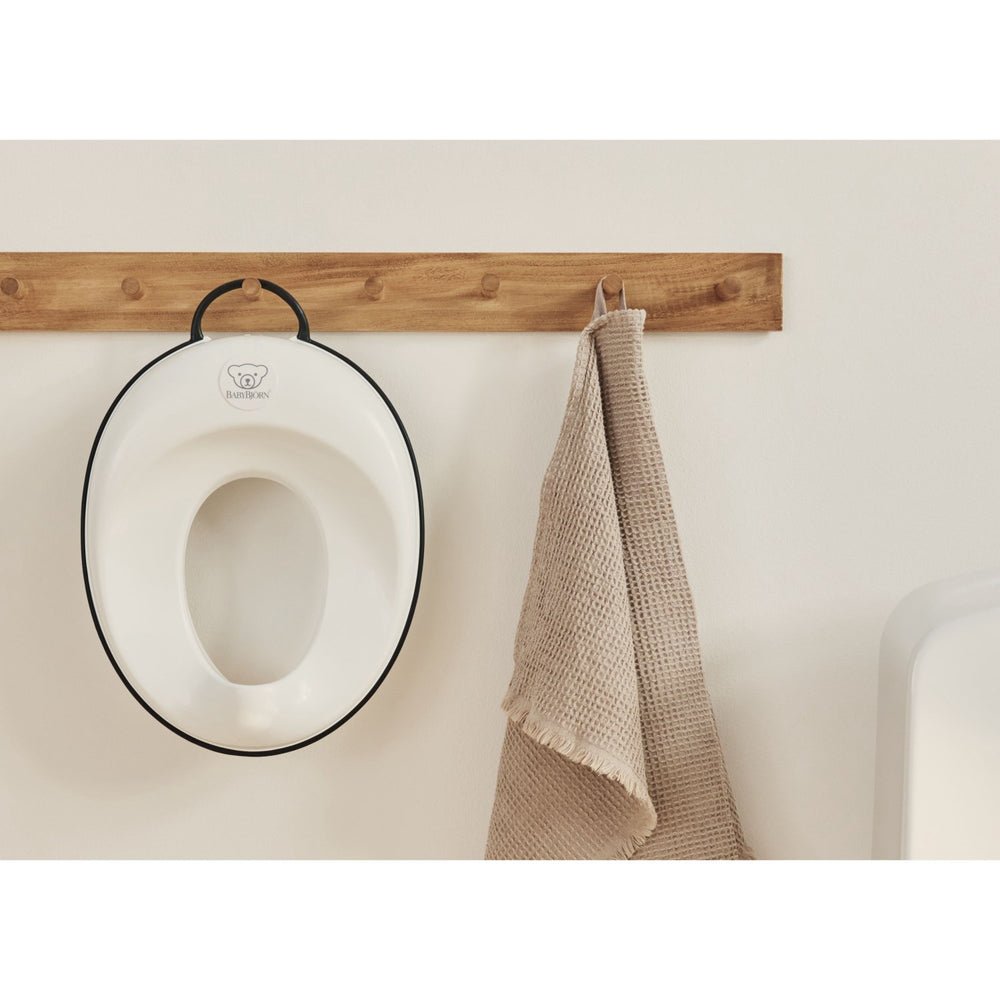 Upptäck komfort och säkerhet med BabyBjörn Toalettsits i stilren vit och svart design, som hjälper ditt barn att använda toaletten självständigt. Denna toalettsits är utrustad med en halkfri gummikant och en justerbar knopp på undersidan, vilket garanterar en stabil passform på alla standardtoaletter. Den praktiska stänkskärmen bidrar till att minska spill och hålla badrummet rent. När toalettsitsen inte används är den enkel att förvara tack vare det integrerade handtaget, perfekt för upphängning. Utmärkt för barn från 2 år och framåt, denna sits främjar självständighet samtidigt som den bibehåller hög säkerhet. Justerbarheten säkerställer att toalettsitsen växer med ditt barn.