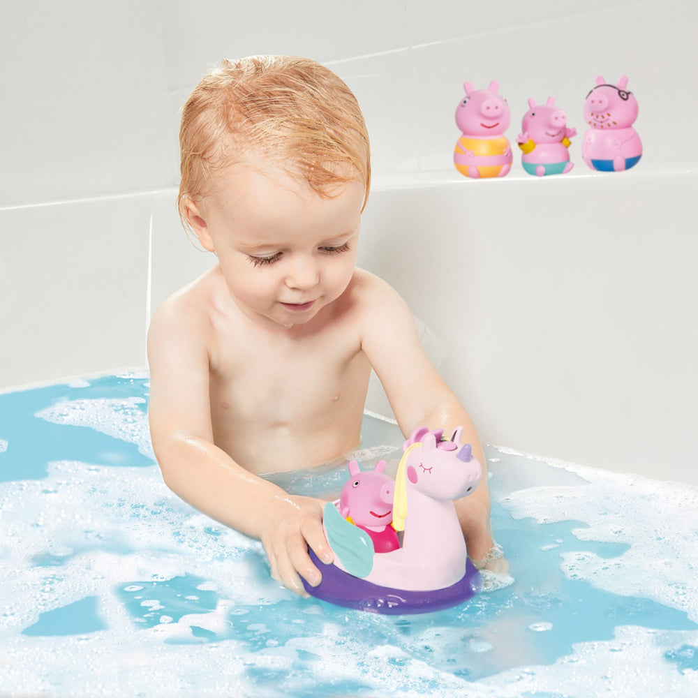 - Placera Greta Gris i enhörningen, fyll enhörningen med vatten och ge Greta Gris en uppfriskande dusch från botten av enhörningen