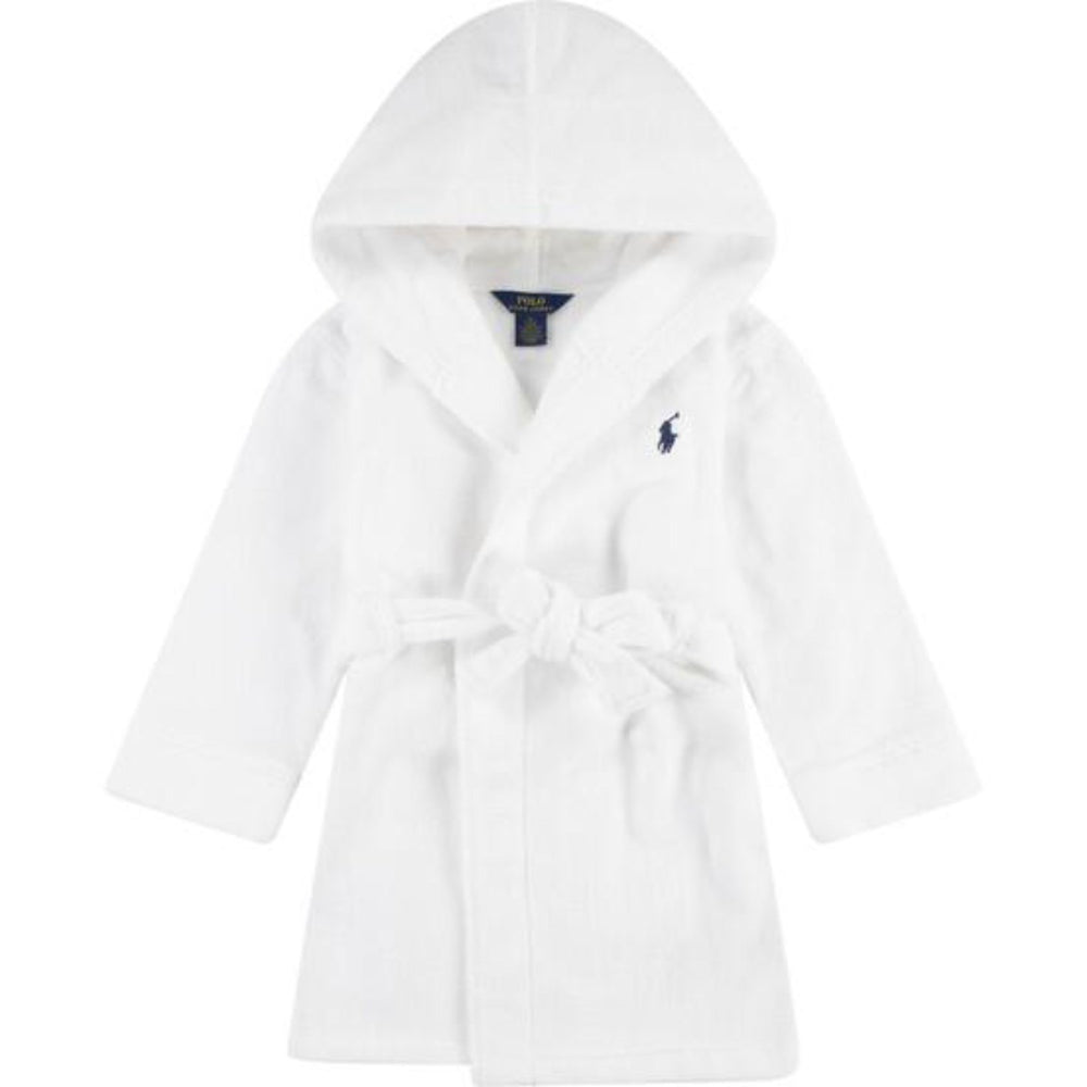 Upplev ultimat komfort med Polo Ralph Lauren White Hooded Plys Terry Badrock, perfekt för barnens avkopplande stunder. Gjord av mjuk frotté som är skonsam mot huden, detta plagg är både praktiskt och stiligt med sin klassiska vita färg och distinkta logga. Huva och skärp förstärker användbarheten, medan den enkla skötseln gör den idealisk för daglig användning. Badrocken är utmärkt efter badet eller för mysiga morgnar, och förenar mode med funktion på bästa möjliga sätt.