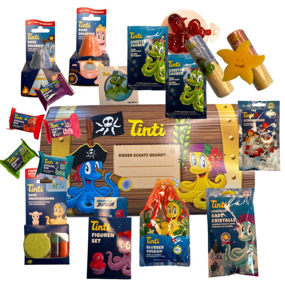 Upptäck spänningen i badtiden med Tinti Skattekista, 19 Delar – en skattkista fylld med roliga och säkra badleksaker för ditt barn. Den här mångsidiga samlingen innehåller 19 olika produkter som kommer att locka och underhålla dina små i badkaret.