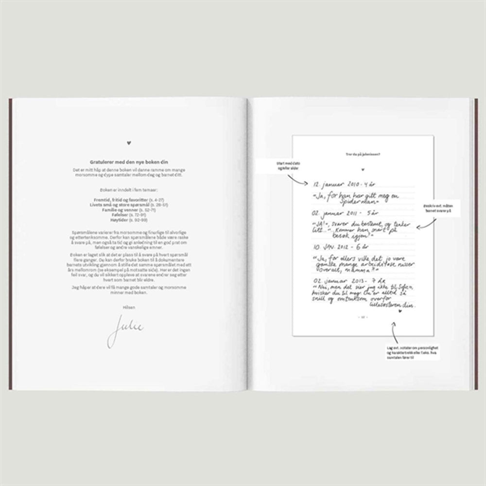 Med denna bok kan ditt barn interagera genom att fylla i sina egna svar, vilket inte bara bidrar till utvecklingen av skriv- och läsfärdigheter, utan också stärker barnets självkänsla och självreflektion. WITHWHITE Spørreboken är inte bara ett sätt för barnet att lära sig och växa, utan också ett förtjusande sätt att bevara minnen som kommer att värderas för livet.
