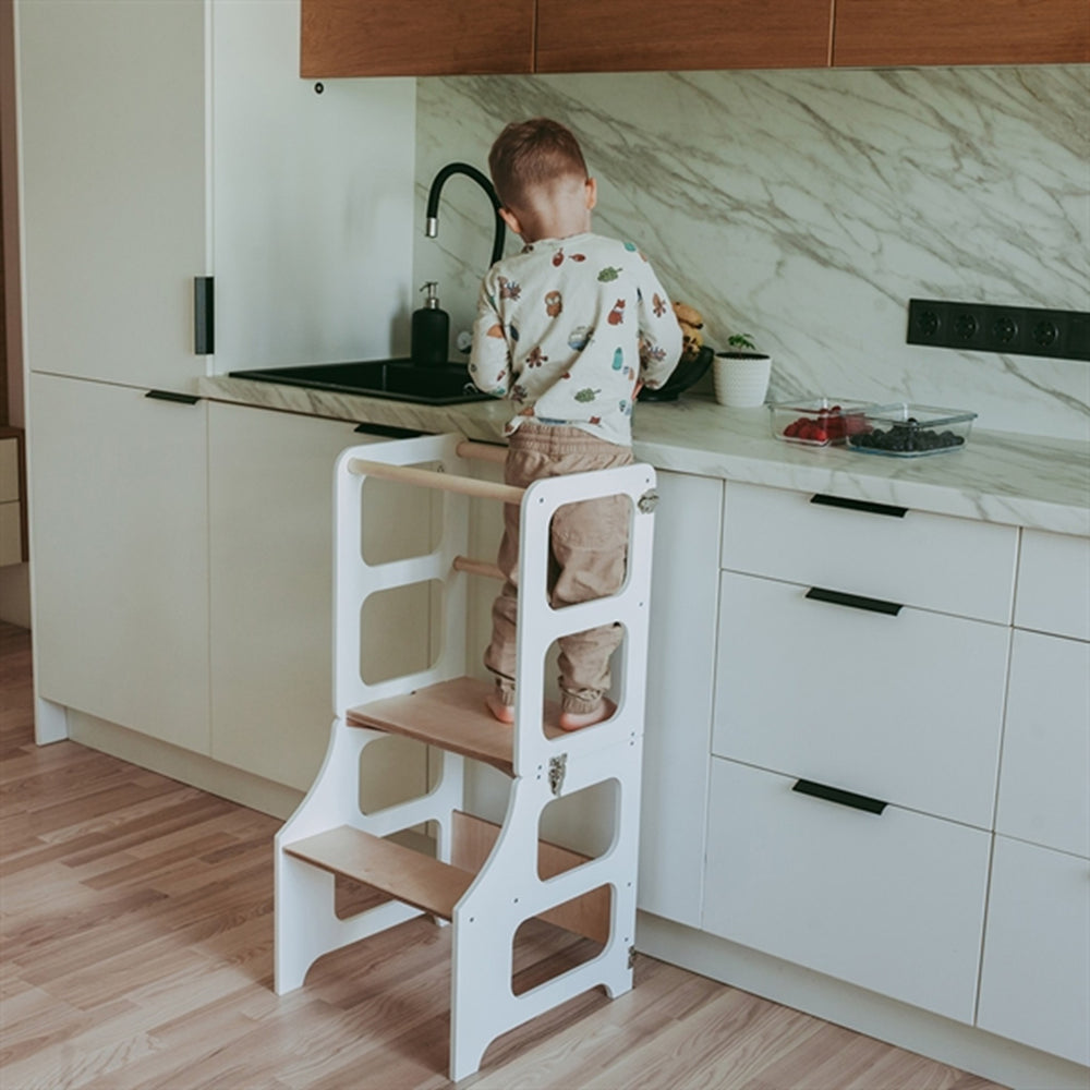 Den vita designen av Duck Woodworks Lärandetorn med Rutschkana kompletterar vackert vilket modernt hem som helst och lägger till en estetisk lockelse i ditt kök eller vardagsrum. Tornet är tillverkat av hållbara material av hög kvalitet som tål daglig användning och är lätta att rengöra.