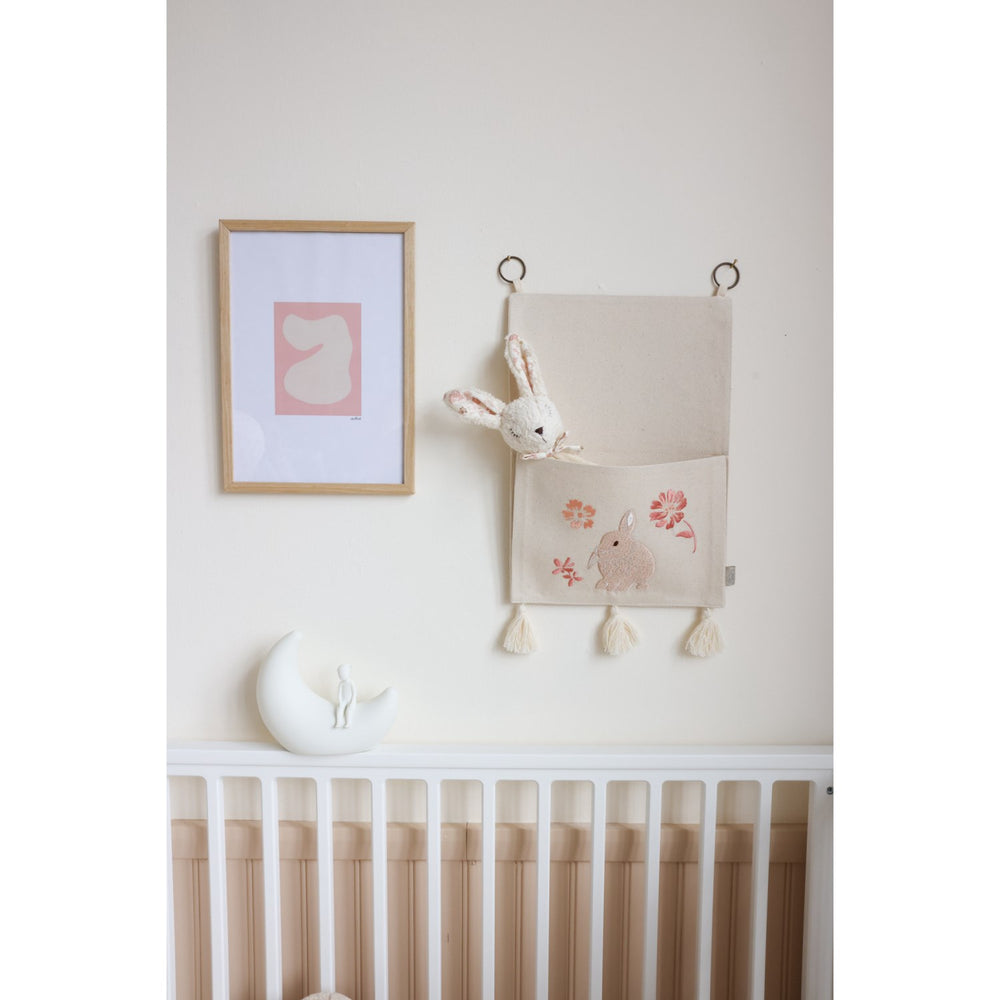 Skapa en trygg och stilfull atmosfär i ditt barns rum med vår Cam Cam Copenhagen Augusta Väggficka. Detta tillbehör är perfekt för effektiv förvaring och för att hålla ordning på allt från leksaker till skrivmaterial. Tillverkad i hållbar, GOTS-certifierad canvas med detaljrika broderier föreställande en bedårande kanin, ger den inte bara praktisk utan även estetisk nytta. Dess ergonomiska design med enkla upphängningsringar i metall gör den lätt att placera där den behövs mest. Kombinationen av funktion, säkerhet och charmig design gör denna väggficka till ett utmärkt tillskott i alla barnrum, och bidrar till både ordning och glädje. Material: 100% ekologisk bomull. Ring: 100% metall. Kategori: GOTS Certifierad Ekologisk - ETKO 4401 Mått: Storlek 37 x 26 x 0.7 cm Tvättråd: Får ej tvättas. Torka endast av med en fuktig trasa. Certifieringar: GOTS