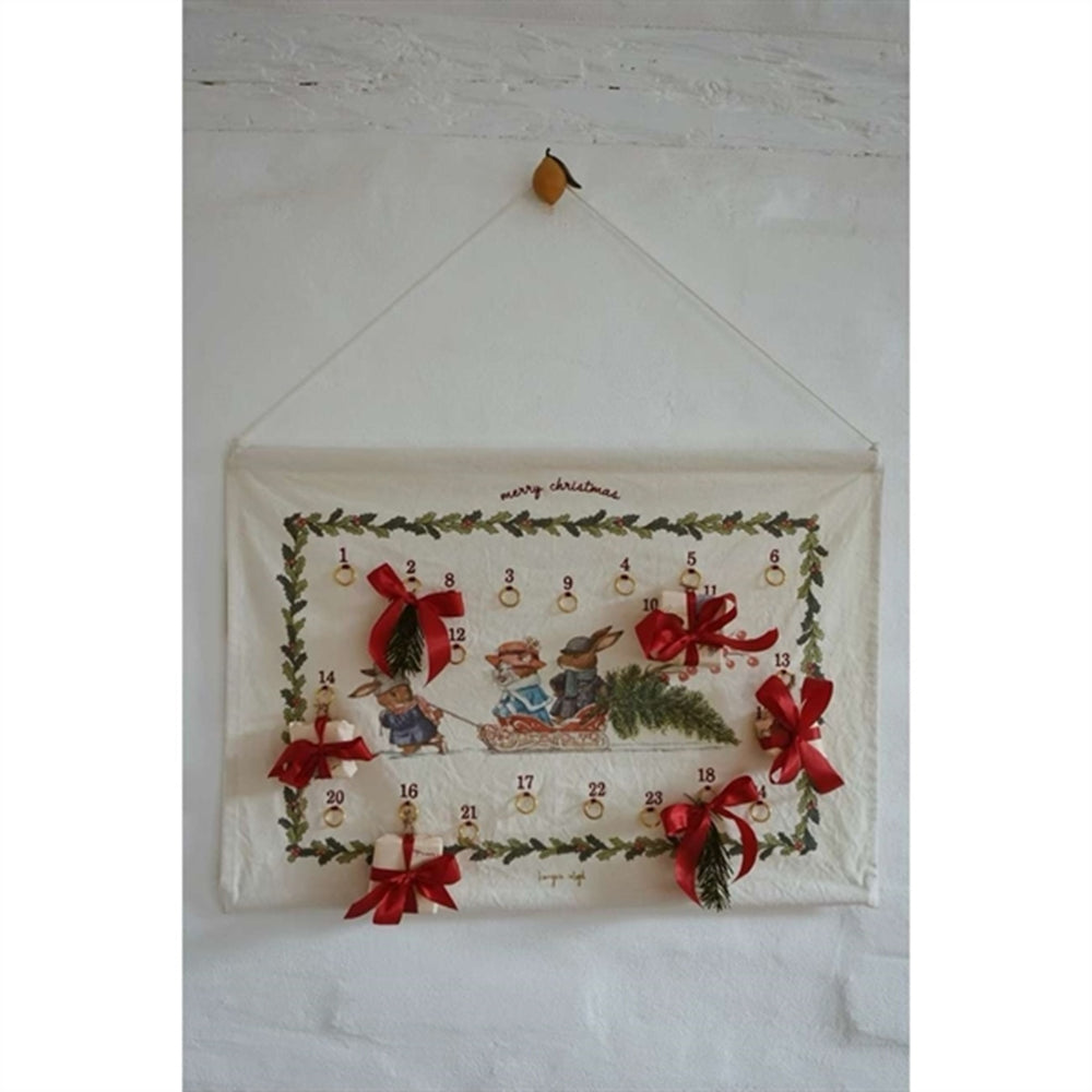 - Designet med broderte tall og 24 gyldne ringer til å henge gaver på