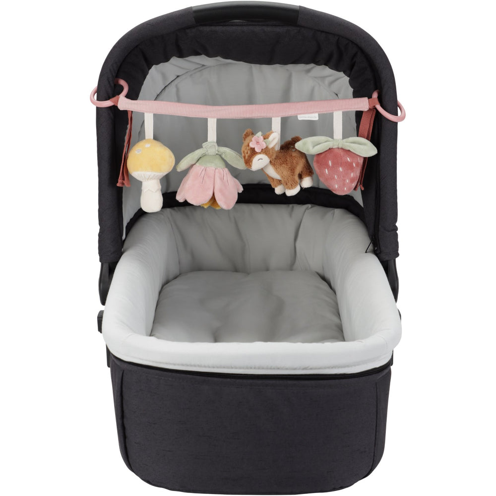 Upptäck Little Dutch Fairy Garden Pink Barnvagnshänge, designat för att både roa och stimulera ditt barns sinnen under promenader. De charmiga leksakerna – en hjort, en jordgubb, en svamp och en blomma – erbjuder olika sensoriska erfarenheter med sina färger och former, perfekt för att främja hand-öga-koordination. Denna barnvagnskedja är inte bara enkel att fästa på barnvagnar eller bilbarnstolar, utan den är också designad med tanke på säkerhet och komfort. Den underhållsvänliga och mångsidiga konstruktionen gör den till en idealisk följeslagare på alla utflykter, samtidigt som den håller ditt barn engagerat och glad.