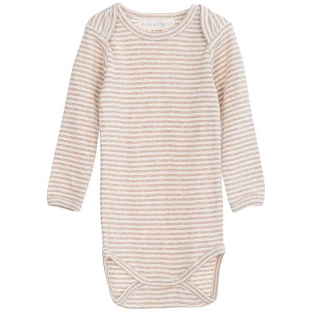 Super läcker bodystocking för de små. Den här med ränder i en fin sandfärgad nyans och benvit. Kroppen har en amerikansk halsringning, så den är lätt att ta av och på. Den har en supermjuk kvalitet och bra passform.