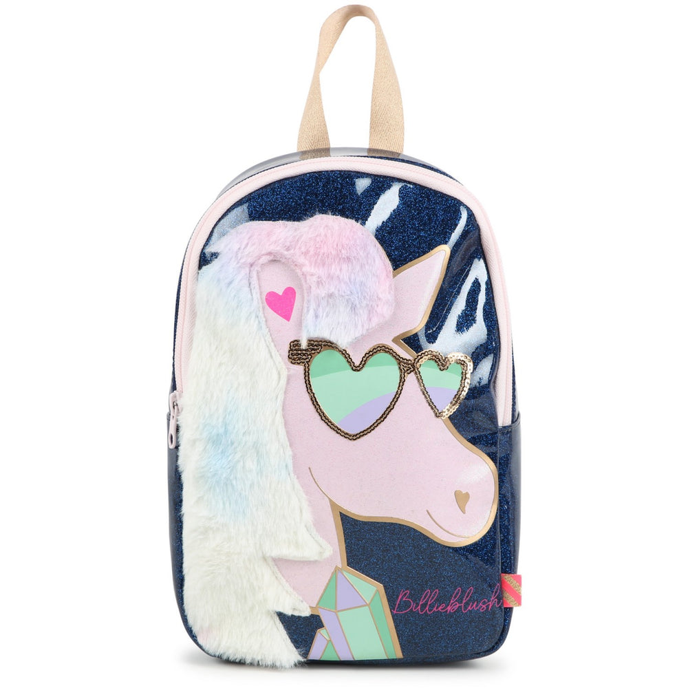 Upptäck vår charmiga Billieblush Navy ryggsäck, perfekt för ditt barns äventyr! Den här lilla ryggsäcken är tillverkad av glitterbelagt tyg med färgglada fuskpälsremmar och en glittrande "Pegaze"-illustration i paljetter och applicerad fuskpäls som ger en lekfull touch. Guldfärgade remmar och en säker dragkedja garanterar både stil och säkerhet. Ryggsäckens inre är fodrat med polyester vilket gör den hållbar och lätt att rengöra. Med sina kompakta mått (27x18x10 cm) och en praktisk randig vävd flik på sidan är den enkel för ditt barn att hantera och organisera sina tillhörigheter. Idealisk för skola, utflykter eller varje dag full av fantasi och lek. Material: 100 % polyvinylkloridbeläggning, 100 % polyester - kantning: 100 % polyester - foder: 100 % polyester