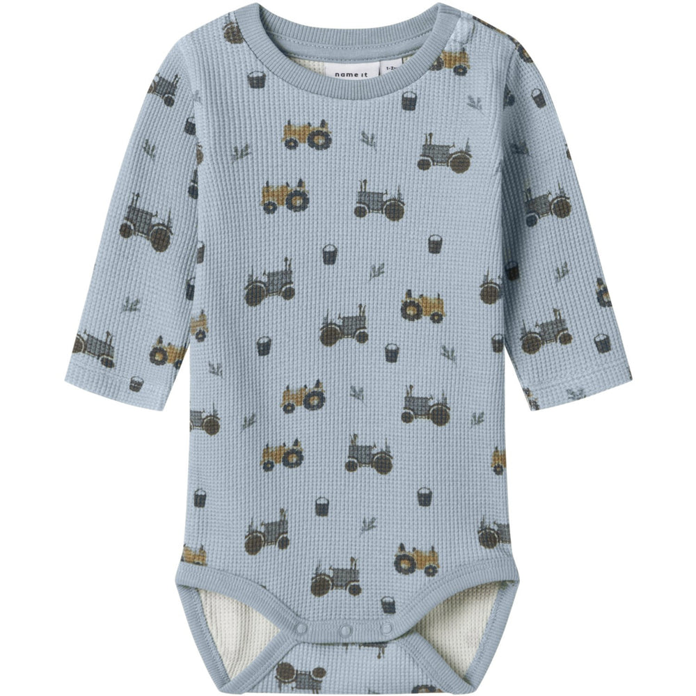 Förnya den lilla äventyrarens klädarsenal med vår Name It Dusty Blue Nbmlactor Ls Body. Denna bodysuit är tillverkad i våffelstickad design vilket inte bara ger en visuell tilltalande yta med små rektanglar utan också en behaglig känsla mot känslig barnhud. Med långa ärmar och rund halsutskärning kombinerar den stil och funktionalitet, och tack vare tryckknapparna vid stängningen blir ombyten snabba och enkla. Klädd i en underbar dusty blue färg med ett subtilt mönstrat tryck, erbjuder denna body både komfort och stil för daglig användning. Idealisk för lek såväl som vila, är den lätt att sköta om och håller sig mjuk och fräsch även efter flera tvättar. Märket Name It är ditt säkra val för hållbar barnmode som kombinerar funktionalitet med trendig design.