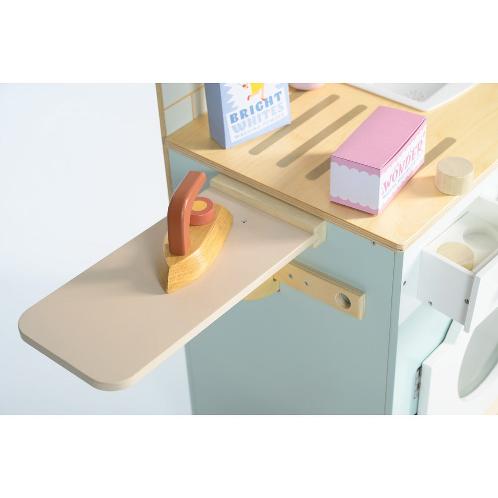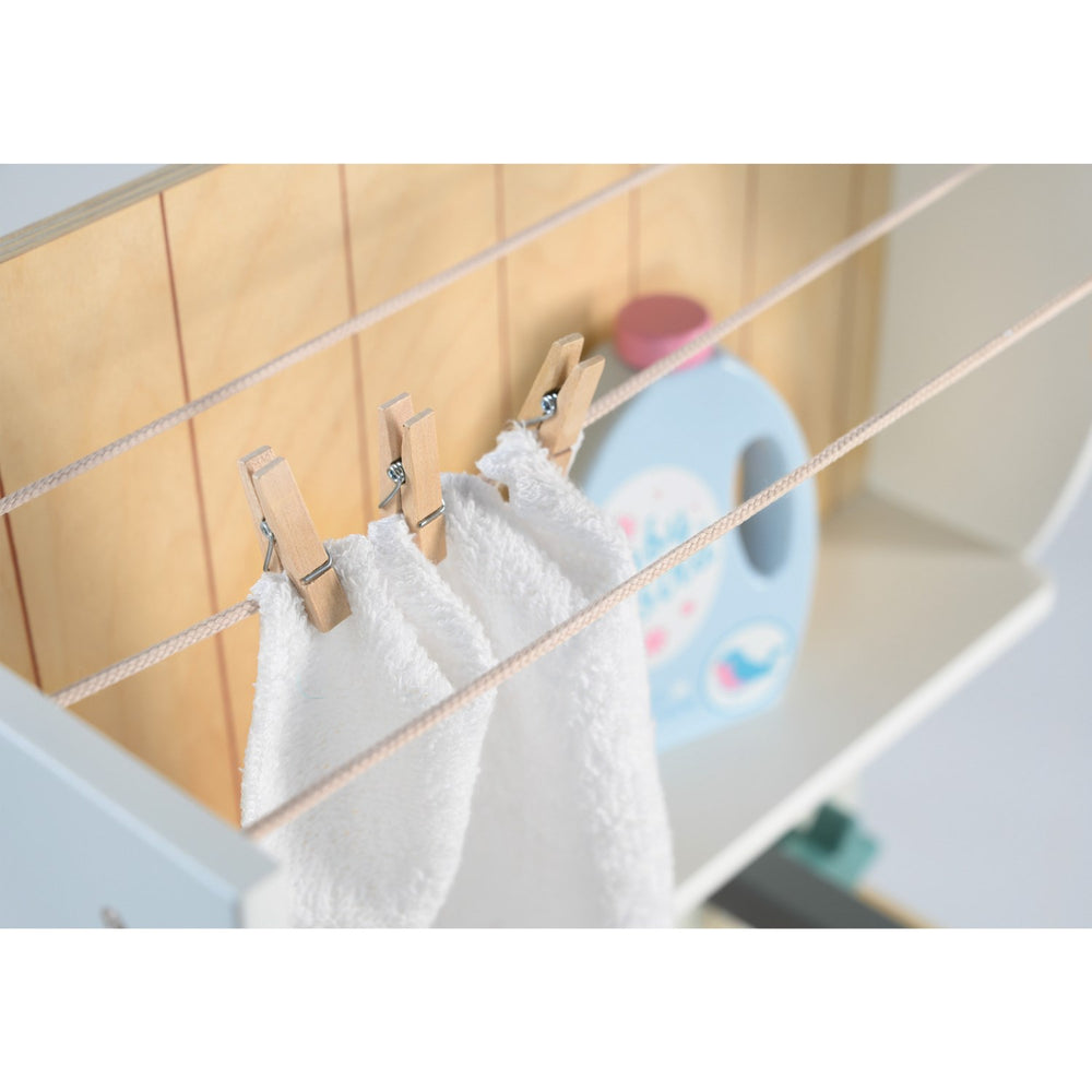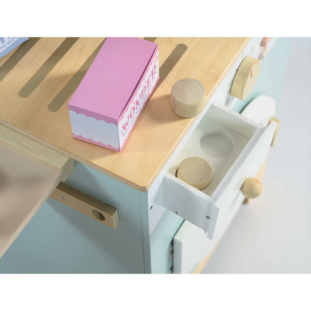 Upplev magin i vardagssysslor med vår "Tender Leaf Vaskemaskine"! Denna charmiga tvättmaskin är designad för att inspirera till lekfullt rollspel bland de yngsta. Perfekt för att tvätta, torka och stryka dockkläder, utrustad med realistiska detaljer som tvållåda, handfat, tryckknappar och klickande knoppar, vilket ger en autentisk känsla. Ytterdörren öppnas för att lägga in kläderna, och de kan sedan hängas på de inkluderade tvättlinorna och strykas på den lilla integrerade strykbrädan. Tillverkad i robust trä, denna tvättmaskin är inte bara säker för barn från tre till fem år, utan även lätt att underhålla. Dess mått på 91.5 x 71 x 33 cm gör den lättplacerad i barnrummet och dess tillhörande tillbehör som tvättmedel, strykjärn, träklämmor och en flätad korg, uppmuntrar till omfattande och engagerande interaktion. Allt detta för att erbjuda både en utbildande och underhållande upplevelse, där barnen kan utforska och utveckla både finmotoriken och fantasin genom lek. En produkt som garanterat kommer att hålla ditt barn engagerat och underlära stunder i sträck.