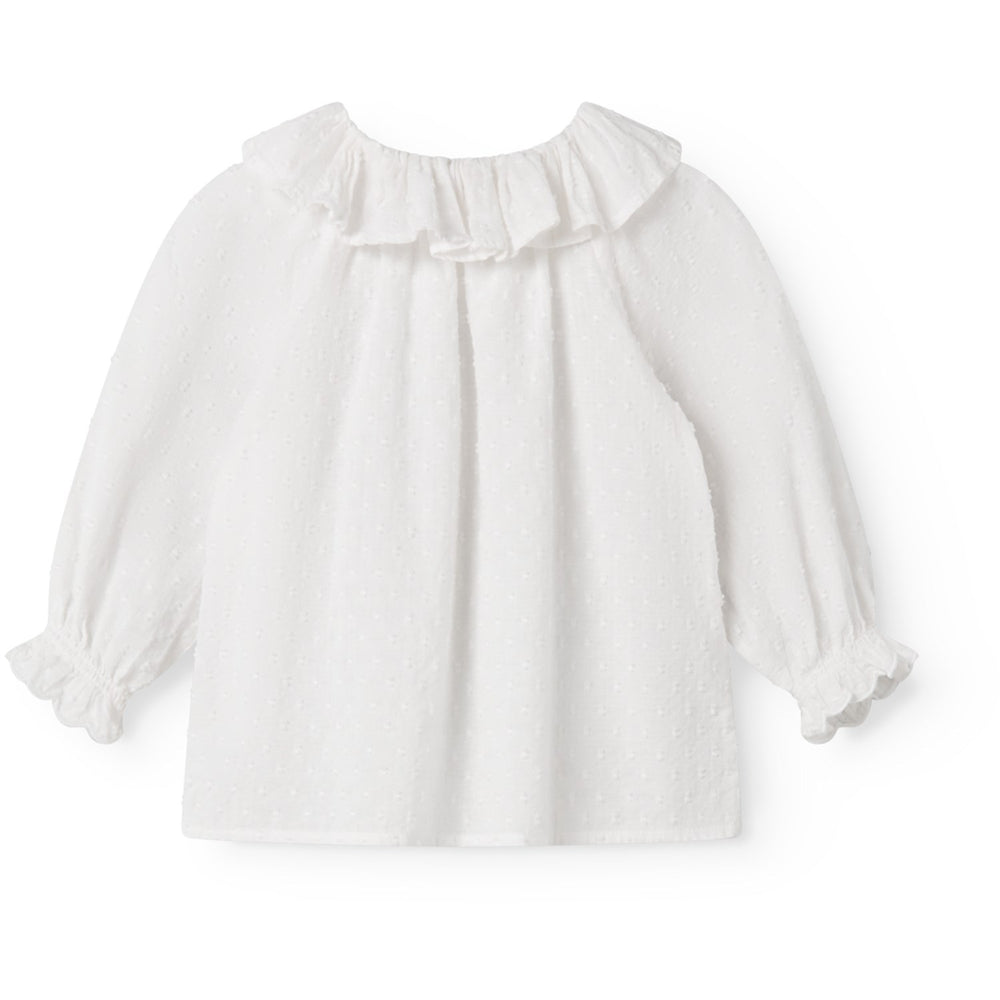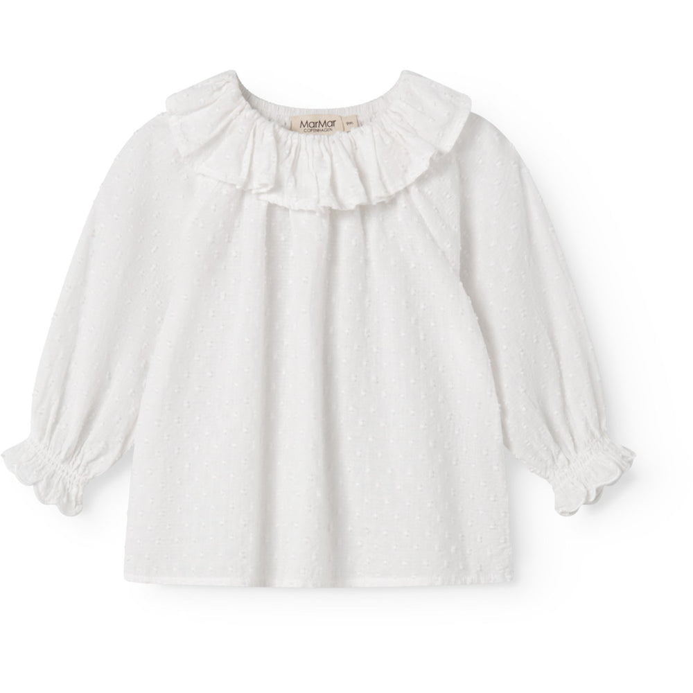 Upptäck vår charmiga MarMar Fine Dobby White Tia Blus, perfekt för små upptäckare. Blusen är tillverkad i behagligt material och designad med långärmad stil som accenteras av fint broderade mönster. Med dess vita färg och delikata detaljer erbjuder den en klassisk look som passar alla tillfällen. Dessutom är blusen praktisk med resår vid både krage och muddar vilket försäkrar en bekväm passform för ditt barn. Idealisk för både vardag och fest!