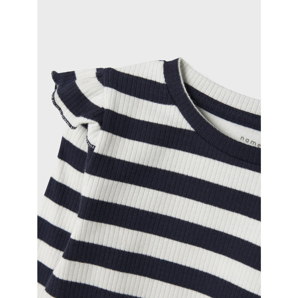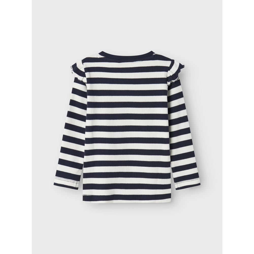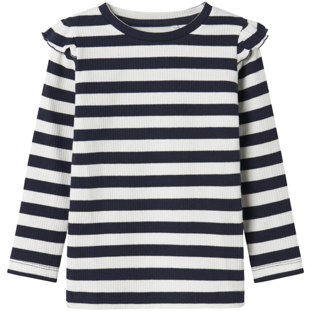 Uppdatera din lilla äventyrares stil med vår "Name It Navy Blazer Taia Slim Blus". Denna charmiga blus är både trendig och praktisk, perfekt för både lekfulla eftermiddagar och större tillställningar. Tillverkad med en skön ribbstickning och ett iögonfallande vertikalt randigt mönster som ger en klassisk touch. Blusen är designad med en rund hals och långa ärmar, komplett med dekorativa krusiduller som tillför en lekfull detalj.