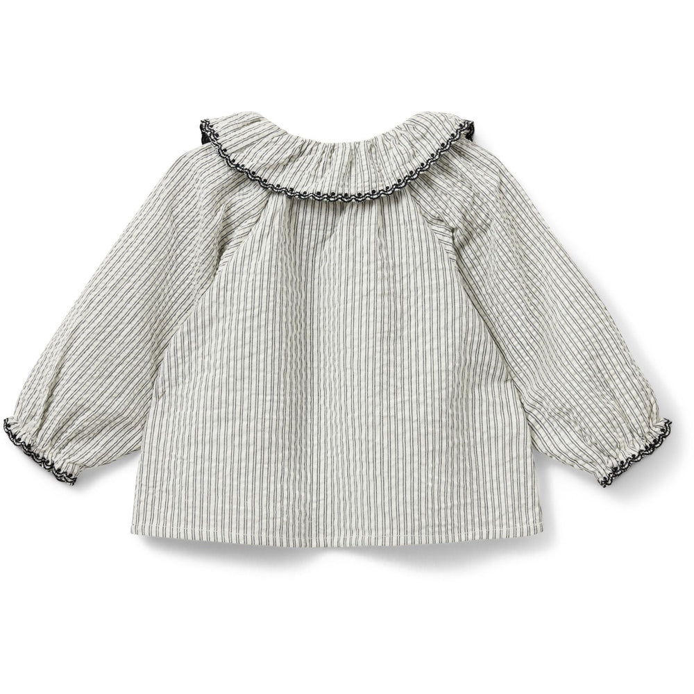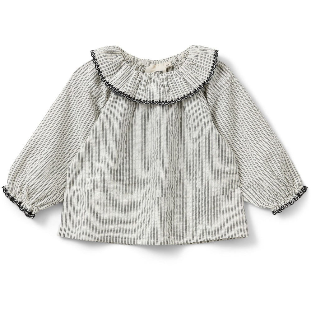 Upptäck den charmiga blusen från Sofie Schnoor, perfekt för ditt barns garderob! Denna blus är tillverkad i ett mjukt och hållbart material, med ett snyggt svart och tunt randigt mönster som ger en tidlös look. Designen kombinerar stil med komfort och är idealisk för både vardag och fest. Passformen är avslappnad och blusen är lätt att sköta, vilket gör den till en favorit för både föräldrar och barn.