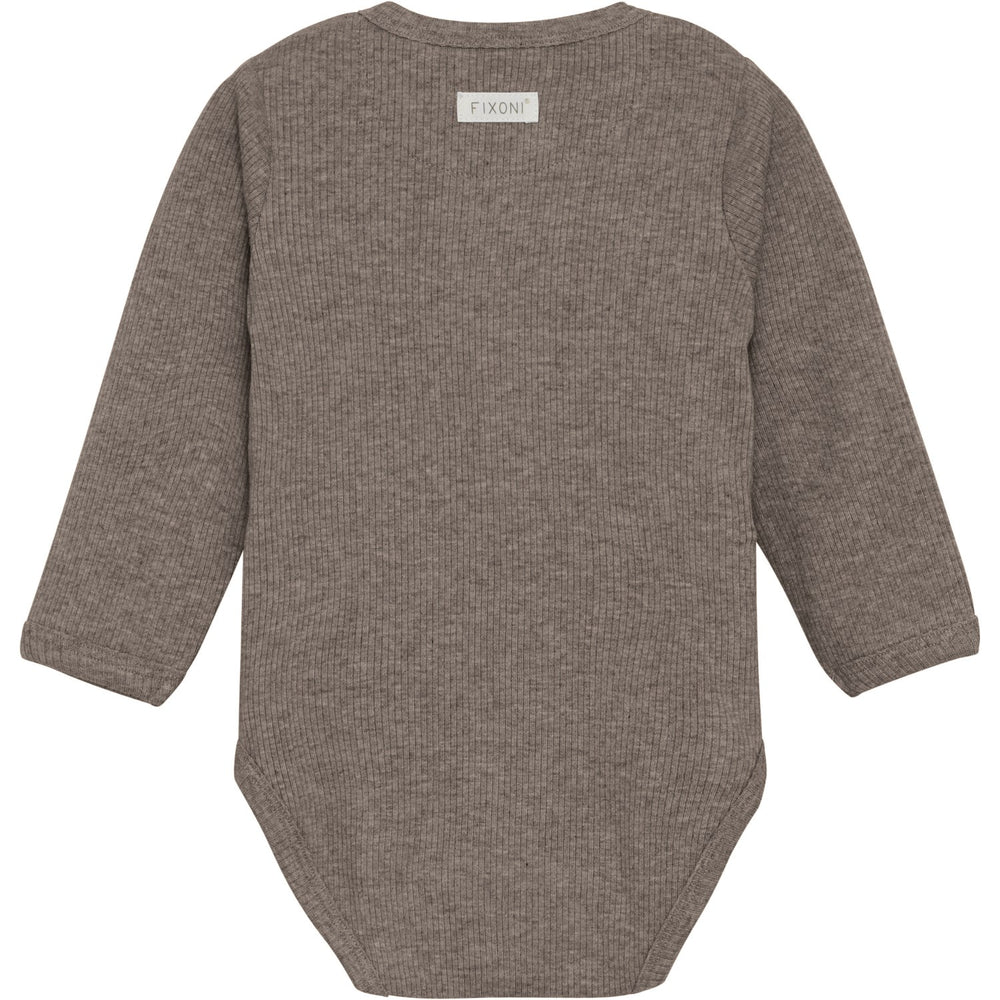 Långärmad omlottbody "Coffee Quartz Melange" från FIXONI, perfekt för din lilla solstråle. Tillverkad i mjuk och skön melerad ribbstruktur med TENCEL-fibrer som ger optimal komfort och hållbarhet. Enfärgad i en elegant kaffekvarts-nyans, designad med praktiska knappar för enkel på- och avklädning. Idealisk för vardagligt bruk och skonsam mot känslig barnhud.