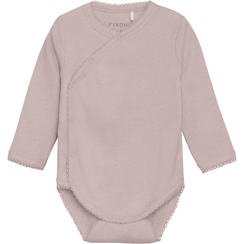 Upptäck vår mjuka och behagliga långärmade omlottbody från FIXONI, perfekt för din lilla älskling. Tillverkad i en skön melerad ribbad kvalitet och designad i en elegant blek mauve nyans, ger den en stilren look. Kroppsnära passform och smarta knappar både framtill och mellan benen gör att bodyn är enkel att ta på och av. Den är tillverkad med hänsyn till barnets komfort, användandes miljövänliga TENCEL-fibrer, vilket gör den både mjuk mot huden och hållbar. Ideell för dagligt bruk, denna body kombinerar funktionalitet med stil på bästa sätt.