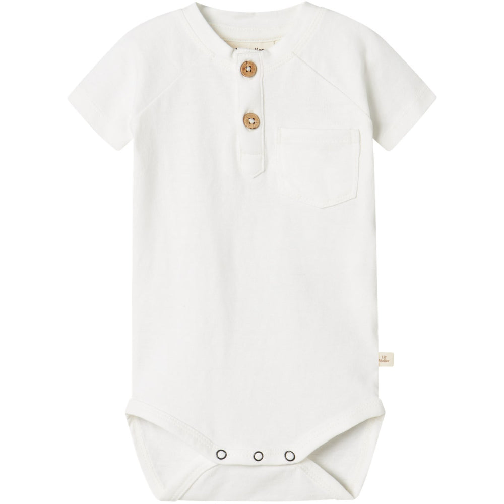 Med en klassisk farfar-hals, korta ärmar och praktisk knapp- samt tryckknappsfästning, är den både elegant och enkel att hantera. Designen fulländas av en snygg bröstficka och en diskret etikett som tillför en fin detalj. Den neutrala "Coconut Milk"-färgen och högkvalitativa material gör att bodysuiten inte bara känns mjuk men också håller hög standard genom frekvent användning.