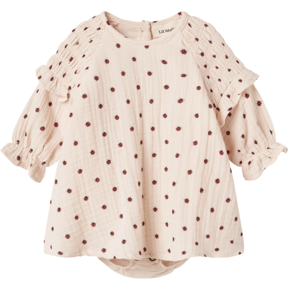Med sin runda hals, långa ärmar med elastiska manschetter och praktiska knapp- samt tryckknappsfästningar, erbjuder denna body både stil och bekvämlighet. Den är dekorerad med charmiga volanger och smockdetaljer, och har ett lekfullt mönster över hela ytan, som adderar en fin touch.
