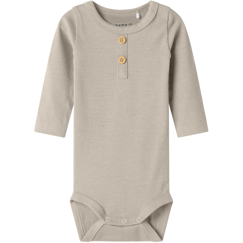 Denna bodysuit är utrustad med långa ärmar och en klassisk rund hals som ger ett rent och snyggt utseende. För enkel påklädnad har den praktiska tryckknappar vid stängningen. Det subtila knappdetaljerna tillför en extra charm utan att kompromissa med komforten. Passformen och elasticiteten i materialet garanterar att ditt barn kan röra sig fritt och bekvämt, vilket gör denna bodysuit till ett idealiskt val för både lek och vila.
