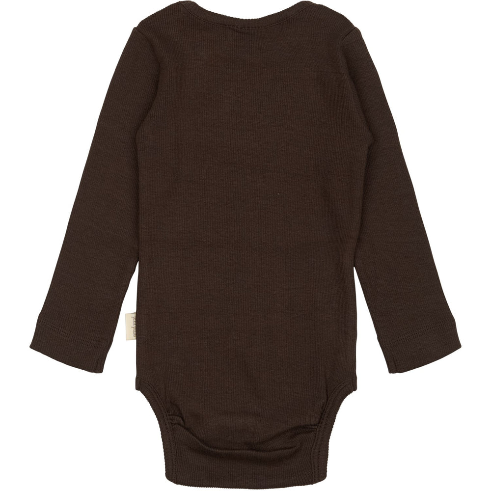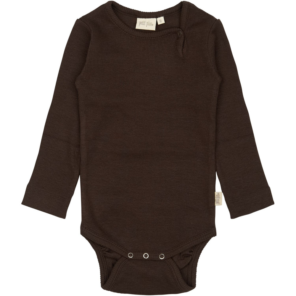 Upptäck Petit Piao Coffee Bean Body L/S Modal - en långärmad body i klassiskt ribbat utförande, designad för de allra minsta. Tillverkad i lyxigt mjukt och stretchigt material som ger optimal komfort och rörelsefrihet. Smidig tryckknapp vid halsen och tre vid botten förenklar påklädning och blöjbyten. Perfekt för vardagligt bruk, framtagen i Indien. Idealisk för småbarn som uppskattar stil och funktionalitet.