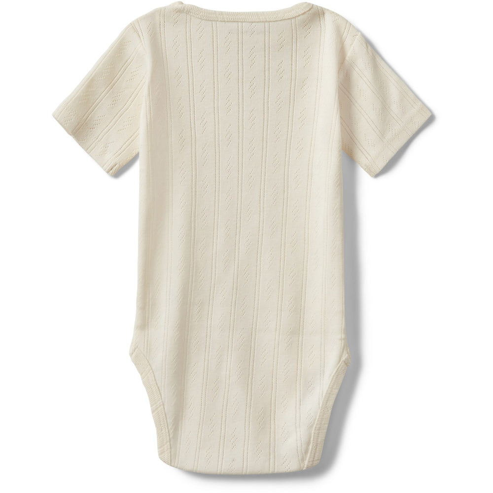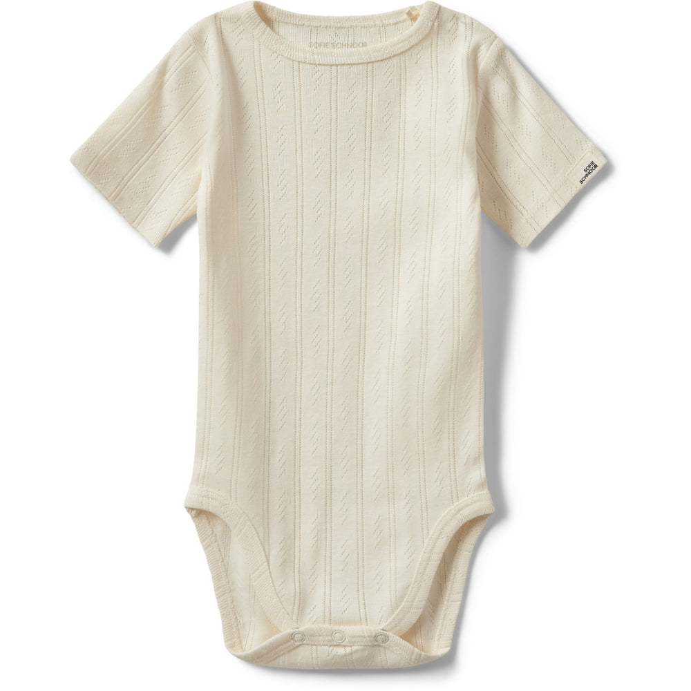 Gör vardagen extra söt med den här charmiga kroppsstrumpan från Sofie Schnoor. I en delikat benvit nyans, prydd med ett delikat pointelle-tryck, kommer denna kroppsstrumpa att kännas mjuk och bekväm mot din lilla älsklings hud. De praktiska tryckknapparna gör det enkelt att ta på och av, medan den klassiska designen säkerställer att ditt barn ser sött ut för alla tillfällen. Perfekt för allt från krypning till familjefest!