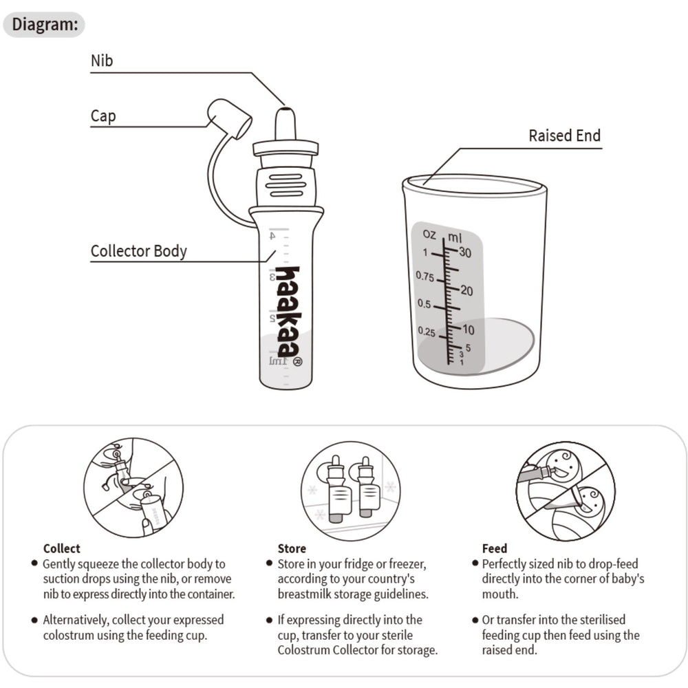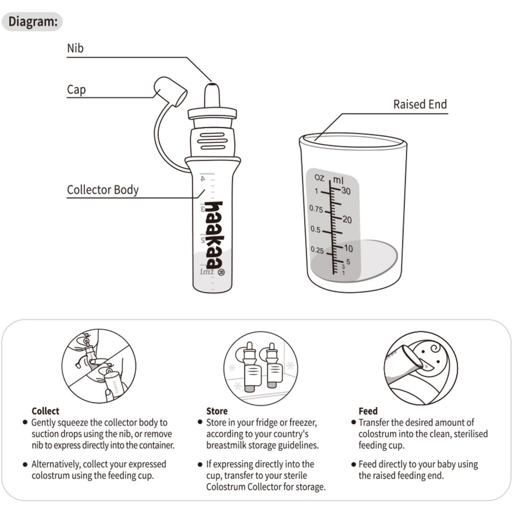 Haakaa Silicone Colostrum Collector är inte bara enkel att använda och underhålla utan även skapad för att stimulera och underlätta den tidiga matningsupplevelsen, vilket gör den till en oumbärlig produkt för nya föräldrar som söker både komfort och effektivitet. Material: Silikon Mått: 8,4 x 1,7 x 3 cm Tvättråd: Sterilisera varje råmjölksuppsamlare före användning med ett ångsteriliseringssystem eller genom att koka i vatten i 2-3 minuter. Använd inte blekmedelsbaserade medel för att rengöra denna produkt. Använd all råmjölk i behållaren för en matning och släng allt som blir över.