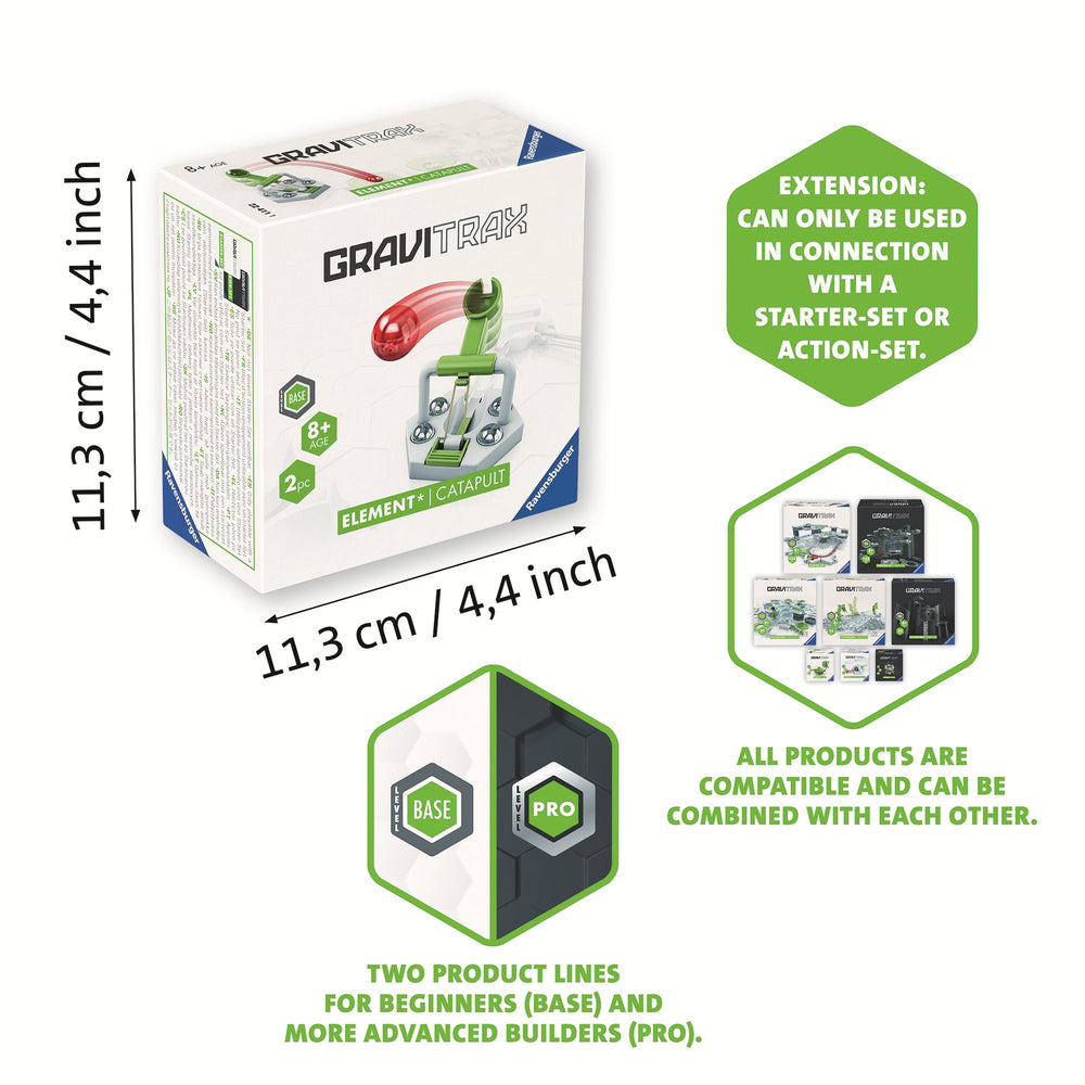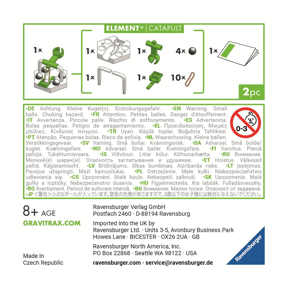 GraviTrax Element Catapult är en säker och robust konstruktion som är lätt att förstå och använda för barn från 8 år och uppåt. Dess kompakta storlek gör det enkelt att förvara och ta med, och med extra gummiringar inkluderade kan barnen experimentera och bygga om sina banor om och om igen utan oro för slitage.