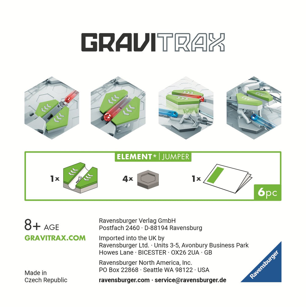 GraviTrax Element Jumper är också enkel att använda, portabel och enkel att förvara. Innehåller en guide, en bygel och fyra stora höjdmoduler som är enkla att montera och demontera, vilket möjliggör smidig förvaring och underhåll.