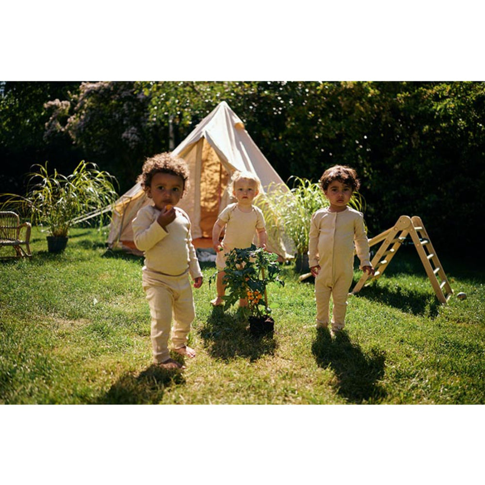 Låt ditt barn uppleva naturens renhet med Gobabygo Feather Root Byxor. Denna charmiga kollektion är noggrant färgad med växtmaterial — ett säkert och allergivänligt val för de små. Tillverkade av 100% ekologisk bomull, erbjuder dessa byxor en otrolig mjukhet och är helt fria från skadliga kemikalier, vilket gör dem idealiska för barnets känsliga hud.
