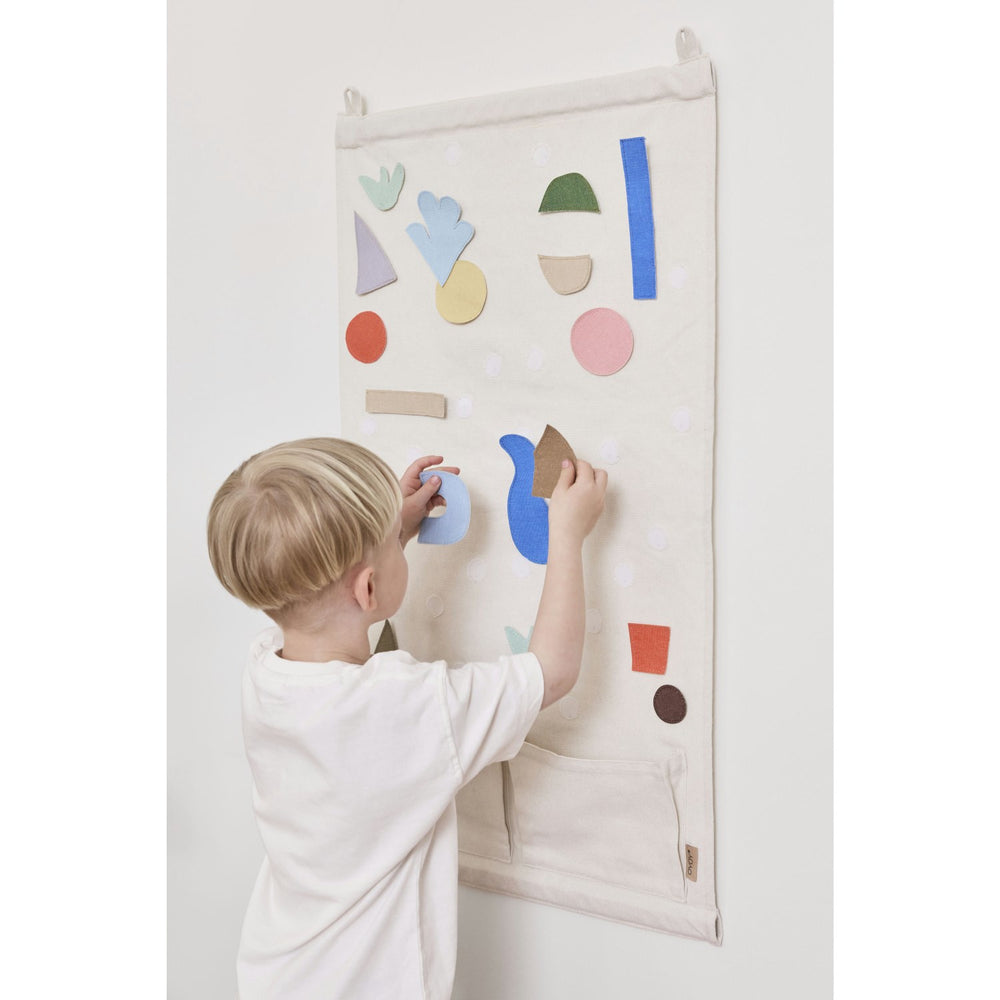 Upplev kreativiteten i barnrummet med Saga DIY väggdekoration från OYOY. Denna unika dekoration erbjuder en perfekt kombination av nytänkande design och praktiska funktioner. Gör barnens rum till en saga med lekfulla färger och mjuka former som inbjuder till att skapa egna mönster, berättelser och scener. Gobelängen är tillverkad av högkvalitativ textil och har två praktiska fickor i botten för att enkelt förvara de lösa filtbitarna.