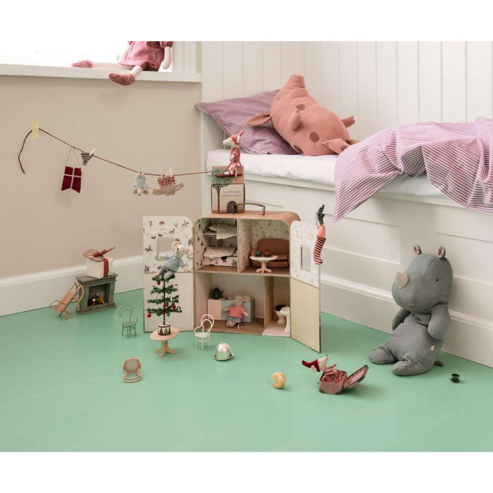 Utforska världen av lek och fantasi med Maileg SuitCasa, perfekt för de små äventyrarna. Detta charmiga dockhus är speciellt utformat för "Lillebror Mus" och "Lillasyster Mus" och är lika säkert som det är inspirerande. Här kan barnen utveckla sin kreativitet och sin förmåga att hantera enkla objekt, vilket gör det till en utmärkt pedagogisk leksak som stödjer barnets utveckling.