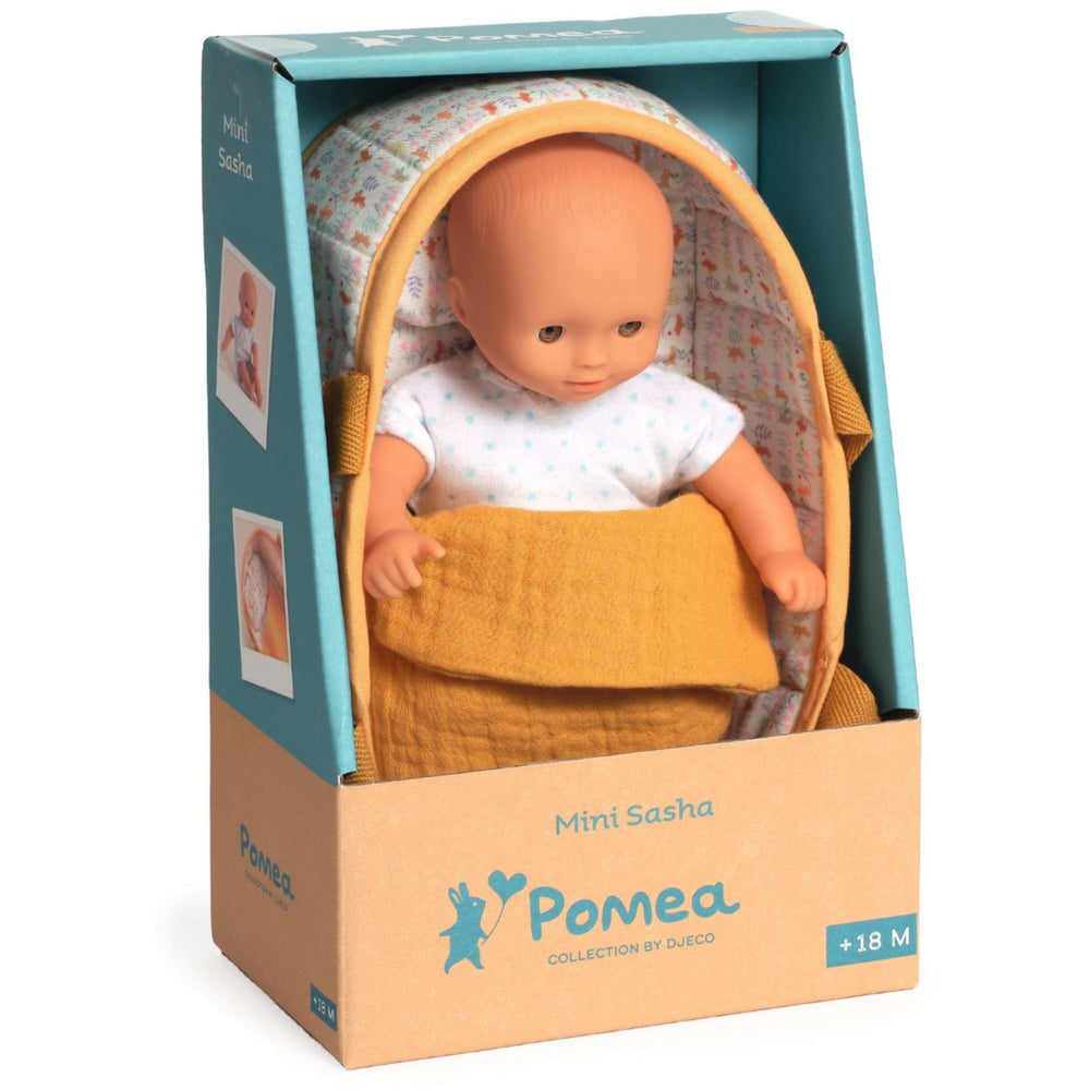 Upptäck Sasha, en förtjusande liten docka från Djeco Pomea Mini som med sina 20 cm och glada ögon kommer att förgylla ditt barns lekstunder. Sasha är specialdesignad för att passa små barn med sin mjuka och flexibla kropp klädd i tryckta nattkläder, vilket gör henne till den optimala kramkompisen. Denna docka kombinerar säkerhet och komfort med en kropp fylld med 100% återvunna fibrer och delar som huvud, armar och ben tillverkade i mjuk, parfymfri vinyl. Med en lätt och praktisk Moses-korg som är utrustad med flexibla remmar, kan Sasha enkelt tas med på utflykter och förvaras smidigt. Dockans leende ansikte med fasta, barnsäkra ögon och detaljer som kudden och filten som är fastknutna med små rosetter erbjuder en lärrik lekupplevelse som stärker barnets motoriska färdigheter och känslomässiga utveckling. Enkelt underhåll lovas eftersom både Sasha och hennes Moses-korg kan tvättas i maskin vid 30 °C, vilket gör det både hygieniskt och praktiskt för föräldrar. Sasha är mer än bara en docka; hon är en trygg följeslagare som stimulerar barnets fantasi och kreativitet.