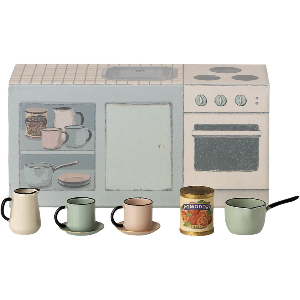 Upplev glädjen och spänningen i lekfulla måltider med Maileg köksbord för mus! Detta charmiga köksset är perfekt anpassat för att passa in i ett SuitCasa mushus och erbjuder en autentisk känsla med sin realistiska design. Tillverkat i metall, är det lilla köksbordet både snyggt och hållbart, komplett med 2 koppar, 2 tallrikar, en kastrull, en kanna och en liten burk.