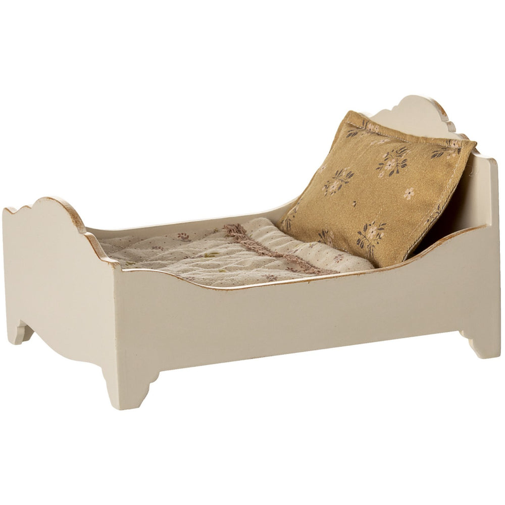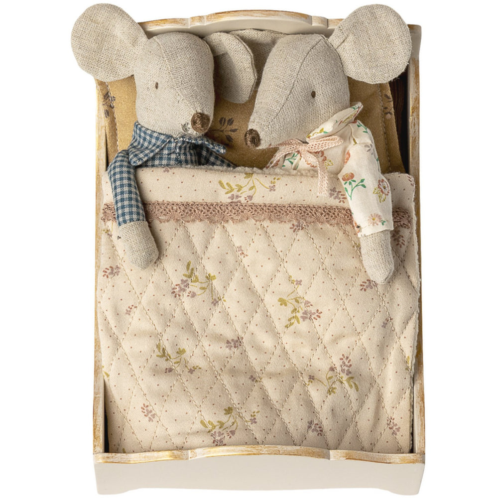 Upptäck Maileg Seng, Mus - Råhvid, en förtjusande dockutrustning som ger ett säkert och charmigt vilorum för dina barns leksaksmöss. Denna vackert designade säng har en robust konstruktion med en elegant gyllene finish på trädetaljer, vilket gör den både tilltalande och hållbar. Den mjuka sängklädseln, fina tyger och omsorgsfulla små detaljer bidrar till en verkligt inbjudande atmosfär.