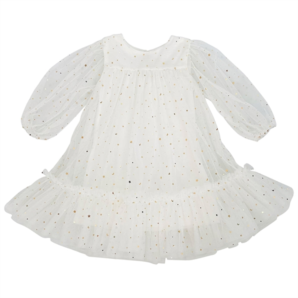 Klä din lilla i natthimlens förtrollning med "Dolly by Le Petit Tom Stars & Moon Empress Tulle Dress." Den här benvita tyllklänningen är ett hisnande tillskott till vilken garderob som helst, med en långärmad design prydd med blinkande stjärnor och månar som fångar kosmos underverk.