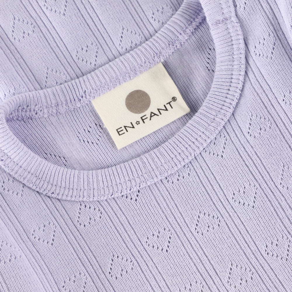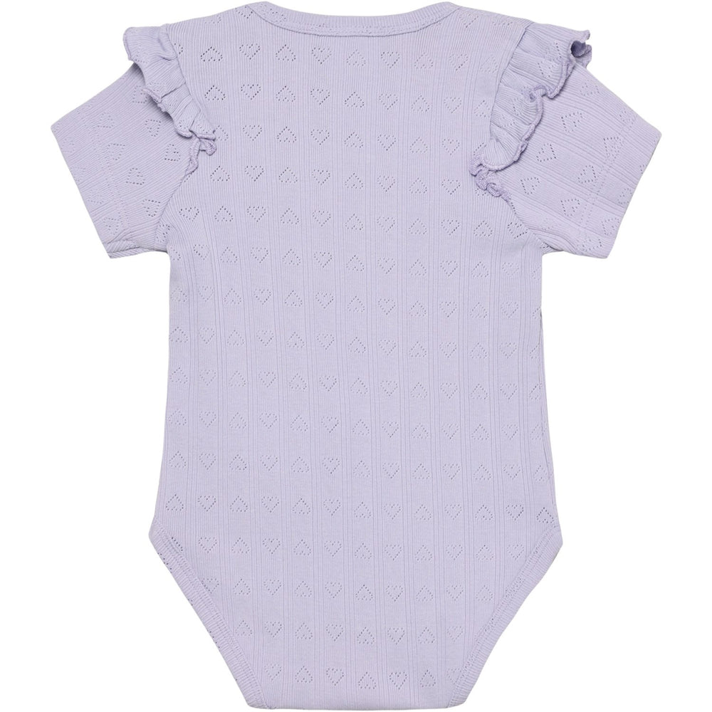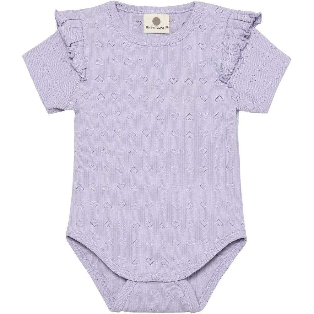 Upplev den ultimata kombinationen av stil och komfort med EN FANTs kortärmade bodysuit i ljuvligt lila heather. Tillverkad i mjuk pointelle med charmiga volanger vid axlarna, är denna bodysuit inte bara vacker utan också praktisk. Enkla knäppningar vid axeln och mellan benen underlättar påklädningen. Perfekt för vardagligt bruk, denna bodysuit blandar funktionalitet med en söt touch av design.