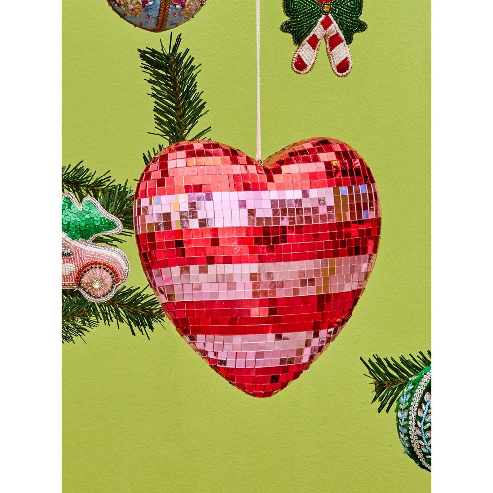 Den här hjärtformade discokulan med röda och rosa ränder är redo för dansgolvet eller barnrummet och ger den ultimata kraften till alla evenemang. Detta skapar en hisnande atmosfär när den långsamt snurrar och reflekterar ljuset runt i rummet. Perfekt för festliga tillfällen eller som en rolig detalj i vardagen.
