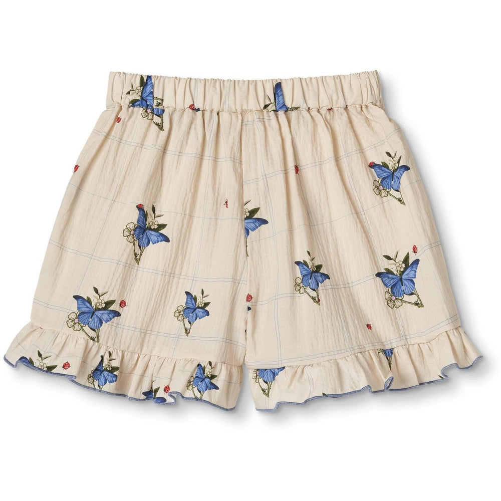 Vävda sommarshorts med ett delikat tryck som för tankarna till våren med fjärilar, blommor och rutor. Shortsen har volanger nedtill med en blå kant som kompletterar trycket.