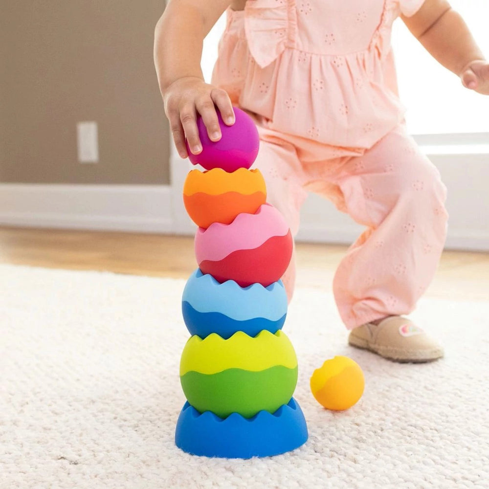 Upplev den spännande världen av balans och färg med Tobbles Neo, det perfekta valet för lekfull lärande. Denna innovativa leksakstorn introducerar små barn till grunderna i fysik på ett roligt och interaktivt sätt. Med sina klara och lockande färger samt en behaglig, gummiaktig textur, är Tobbles Neo utformad för att stimulera barnens sinnesintryck och motoriska färdigheter. Tobbles Neo består av sex unikt viktade delar som kan staplas och balanseras på otaliga sätt. Dessa delar är skapade för att vara lätta för små barnhänder att gripa och manipulera, vilket uppmuntrar till utforskande och fri lek. Tack vare sitt hållbara och lättrengjorda material är Tobbles Neo både enkel att underhålla och idealisk för aktiva barn. Denna leksak är inte bara ett utmärkt visuellt och taktilt verktyg, det främjar också utvecklingen av finmotorik och problemlösningsförmågor. Tobbles Neo är lämplig för barn från sex månader och uppåt, vilket gör det till en fantastisk första leksak som växer med barnet. Dess bärbarhet gör att barnen kan ta med den på resor och dess design gör att den enkelt kan förvaras. Ge ditt barn en lekfull start i livet med Tobbles Neo – där leken aldrig tar slut!