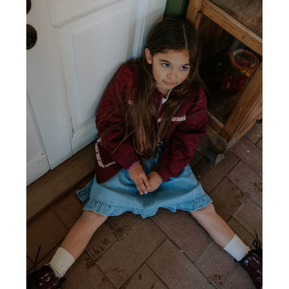 Upptäck den charmiga Fliink Burgendy Kota Vändbar Flower Jacka - perfekt för små äventyrare! Denna jacka erbjuder två stilfulla alternativ i en och samma design. Den ena sidan pryds av ett lekfullt rosenmönster med volangdetaljer som ger en unik touch, medan den andra sidan är elegant i vinröd med ett quiltat diamantmönster. Tillverkad i 100 % bomull garanterar den både komfort och hållbarhet. Jackans ribbmuddar vid ärmsluten håller kylan ute och ger en skön passform. Enkel att sköta - maskintvättas vid 30°C. Ett mångsidigt och praktiskt plagg som håller ditt barn varmt och stiligt på kyliga dagar.