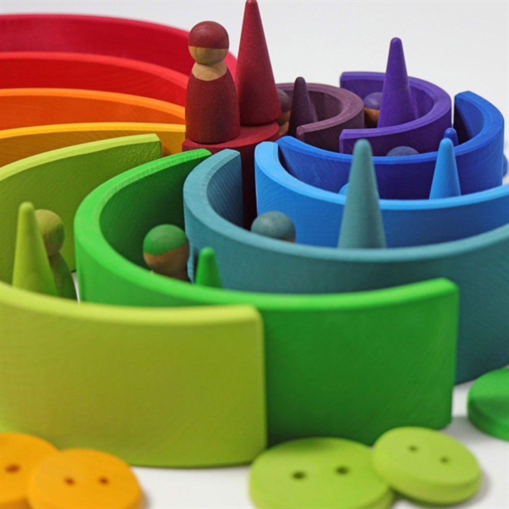 GRIMM'S Regnbue Large erbjuder mycket mer än bara underhållning. Setet är utmärkt för att utveckla barnets finmotorik och problemlösningsförmåga, samt stimulerar deras fantasi och kreativitet genom interaktiva och engagerande lekaktiviteter. Leksakernas lätthanterliga storlek och form gör dem enkla att använda för små händer, och de är lika lätta att stapla och förvara, vilket minimerar röran i hemmet.