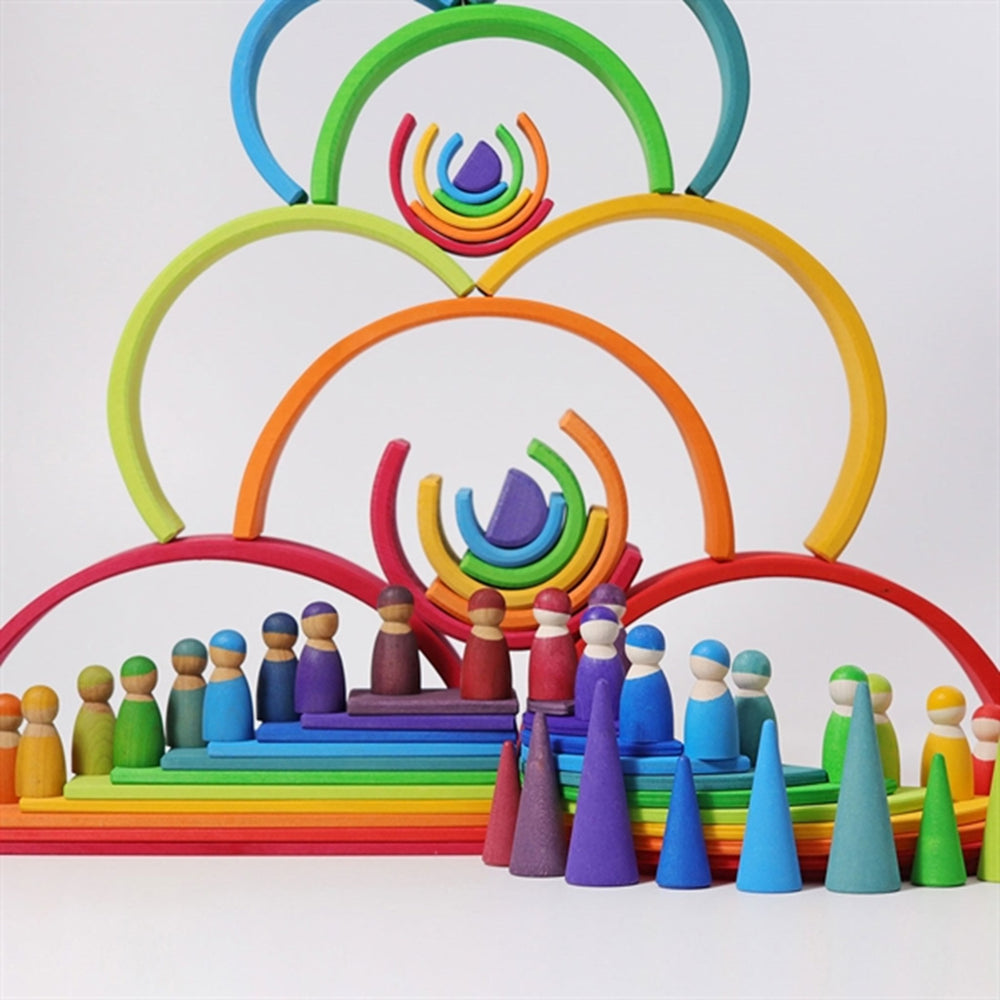 Upplev en värld av färger och kreativitet med GRIMM'S Regnbue Large – perfekta byggklossar för varje litet äventyr! Dessa leksaker är inte bara anslående vackra i sin regnbågspalett, de är även utformade för att vara säkra för barn från tre års ålder. Med sin robusta träkonstruktion och giftfria färger säkerställer de en trygg lekstund.