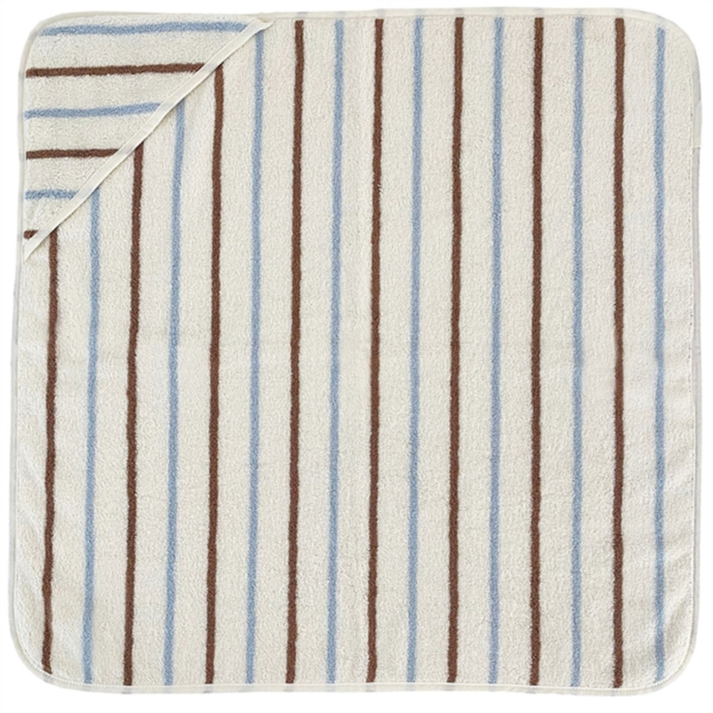 Super fin handduk från OYOY. Denna är i vitt med ränder i de finaste bruna och blå färgerna. Handduken är försedd med huva så att du enkelt kan svepa den runt ditt barn. Riktigt fin kvalitet, bara att ta med till stranden eller till poolen.
