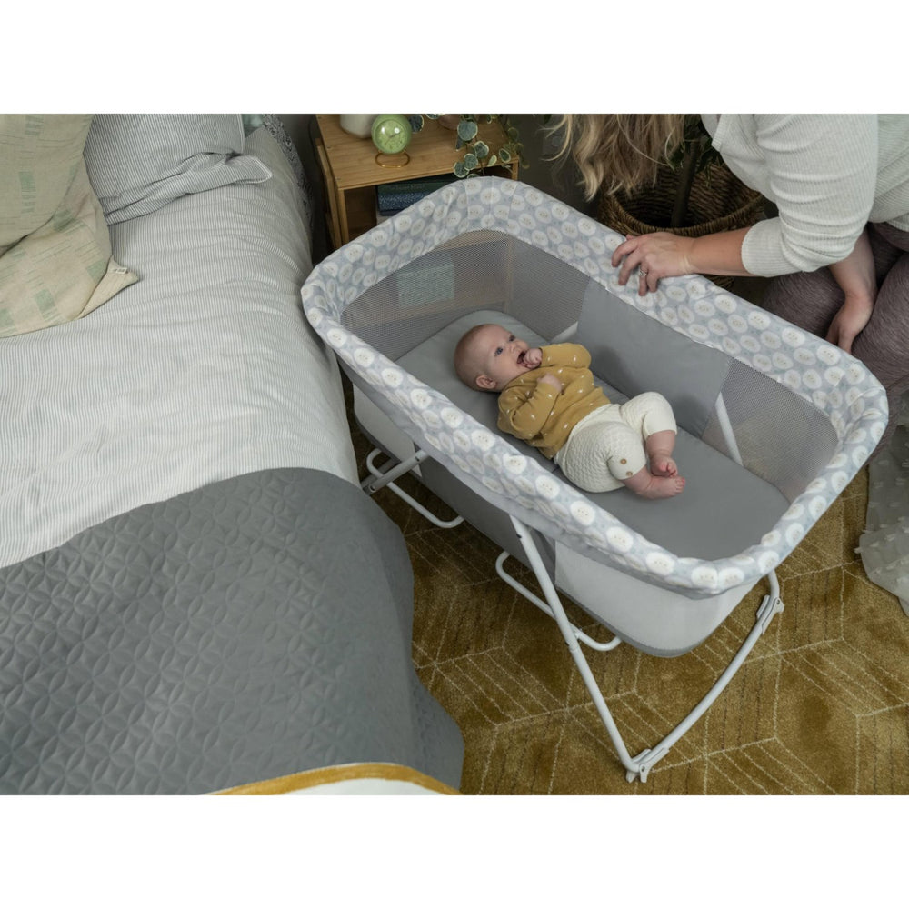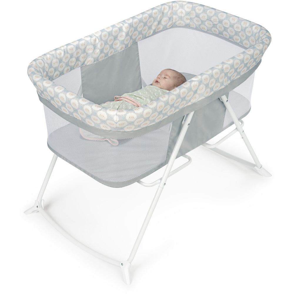 Upptäck Ingenuity Grey Vugge "Soothe & Stow", den perfekta resesängen som kombinerar säkerhet och komfort för de minsta. Den här vaggan är godkänd för bebisar upp till 7 kg och är utformad med hög säkerhetsstandard, inklusive ventilerande mesh-sidopaneler som inte bara ger utmärkt luftcirkulation utan också gör det enkelt för föräldrar att hålla ett öga på sitt barn. Ingenuity Soothe & Stow är enkel att använda; den kan snabbt fällas ihop vilket gör den idealisk för förvaring och transport. Dess multifunktionella design tillåter användning som både rörlig vagga och stabil sovplats, med en lugnande vaggfunktion och en säker sömnfunktion. Dessutom är det söta, neutrala tyget med fårsmotiv lätt att ta av och tvätta, vilket underlättar underhåll. En mångsidig och praktisk lösning för både vardag och resor.
