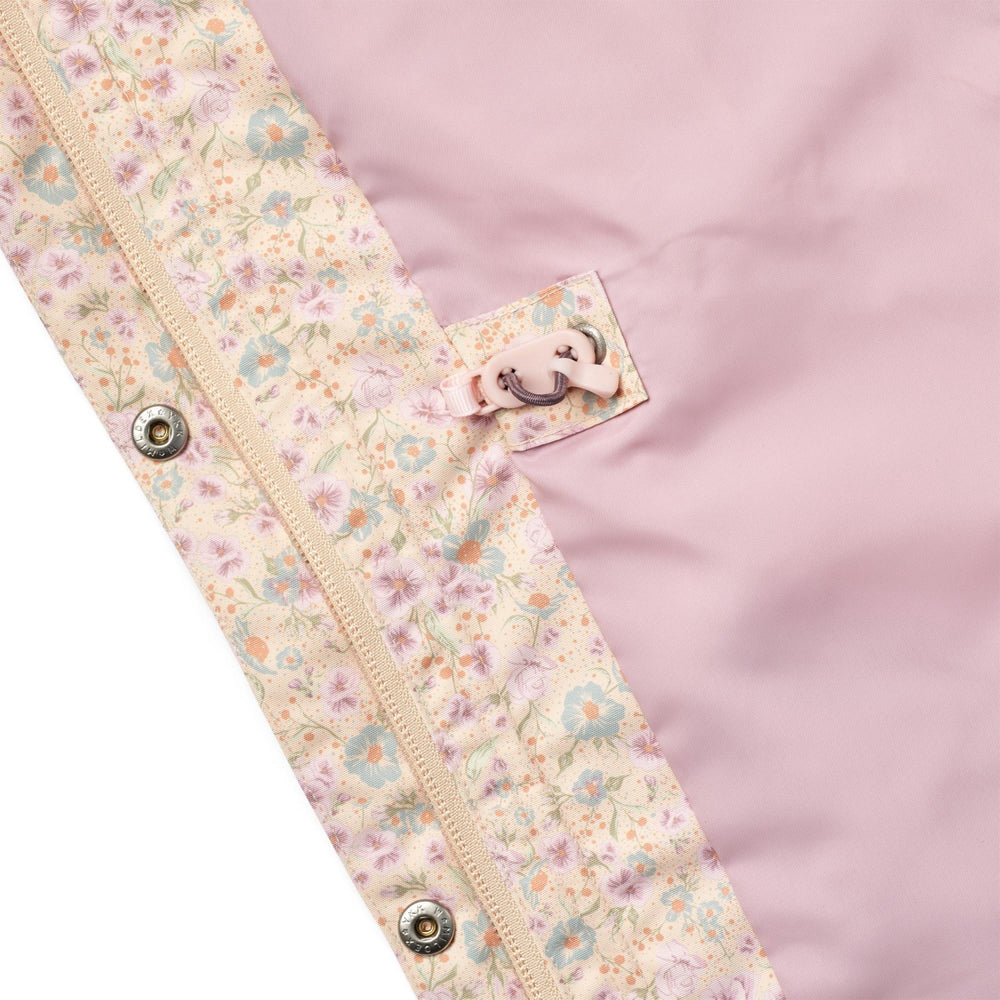 Upptäck den perfekta barnjackan för de växlande säsongerna! Wheat Pansies Jacka Ada är en teknisk jacka utformad för att hålla ditt barn torrt och bekvämt tack vare dess vattentäta och andningsbara material. Denna charmiga jacka kombinerar funktionalitet med stil, framhävd med en A-linjeform, handritade tryck och en varierad färgpalett från Wheats designteam.